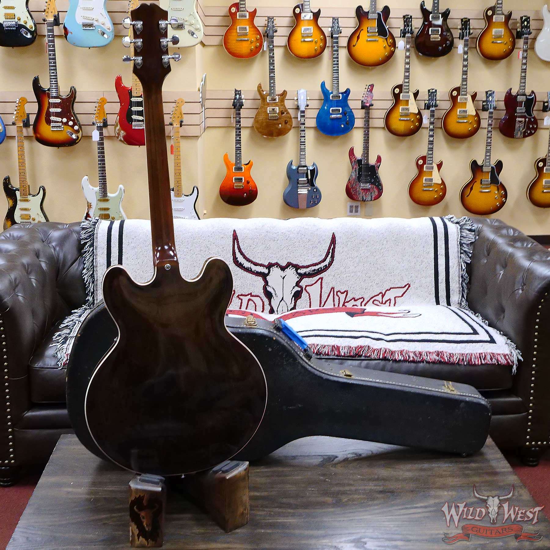 This instrument is an excellent player with mid-range focused tonality and Gibson Custombucker pickups that were professionally installed. Refinished neck with replacement Grover tuners with covered holes and professionally done. Some weather checking on the back of the body and around the input jack but no headstock or heel repairs. Professionally refretted so the guitar plays nicely up and down the fretboard with all of the notes sounding even and full. Comes with a Gibson hardshell case from the 70’s.