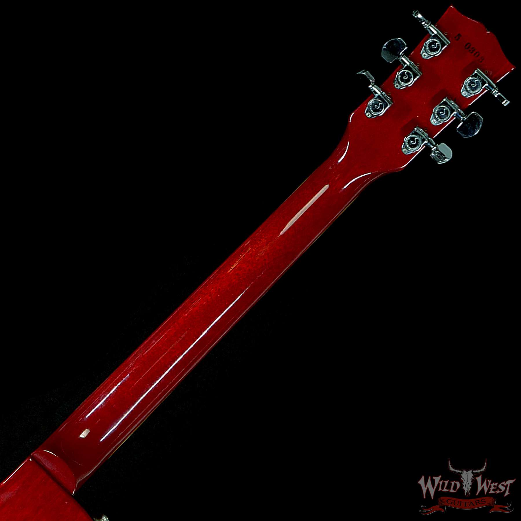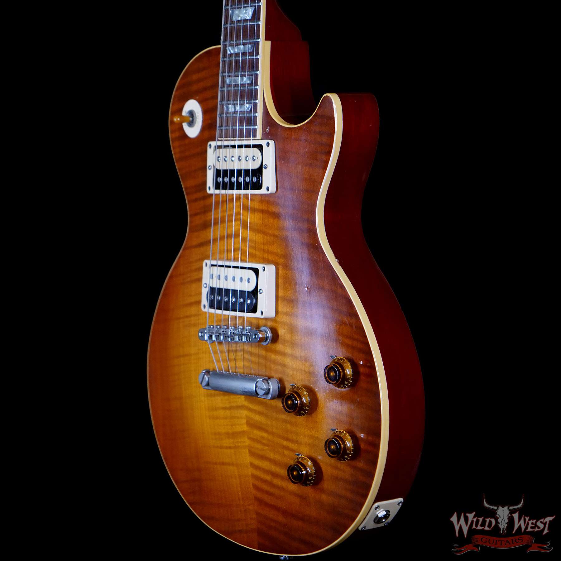In 1985 the Gibson musical instrument company made three very special guitars to celebrate the opening of the Guitar Center in Hollywood store on Sunset Blvd in their new location, where it is currently located today. These limited edition guitars were made to approximate the Gibson Les Paul Standards produced from 1958 to 1960. The wood was carefully selected and these were not built on the production line but by individual Gibson’s top luthiers, along the lines of Gibson Custom Shop instruments built today. The guitar that is being offered( serial number # 50303) is one of the 3 instruments from this limited edition run. This was originally sold to guitarist J.J. French, of Twisted Sister during that year. He would later sell it to Jon Levin of Dokken in the late 2000s. The guitar is has had some changes done by Jon-changed tuners and pickups- but all the original parts were kept and are included with this instrument. The guitar has a Bourbon Burst shading to the gorgeous flamed maple top. The instrument has also had a professional refret, helping it play wonderfully up and down the fretboard, with all the notes sounding even and full.