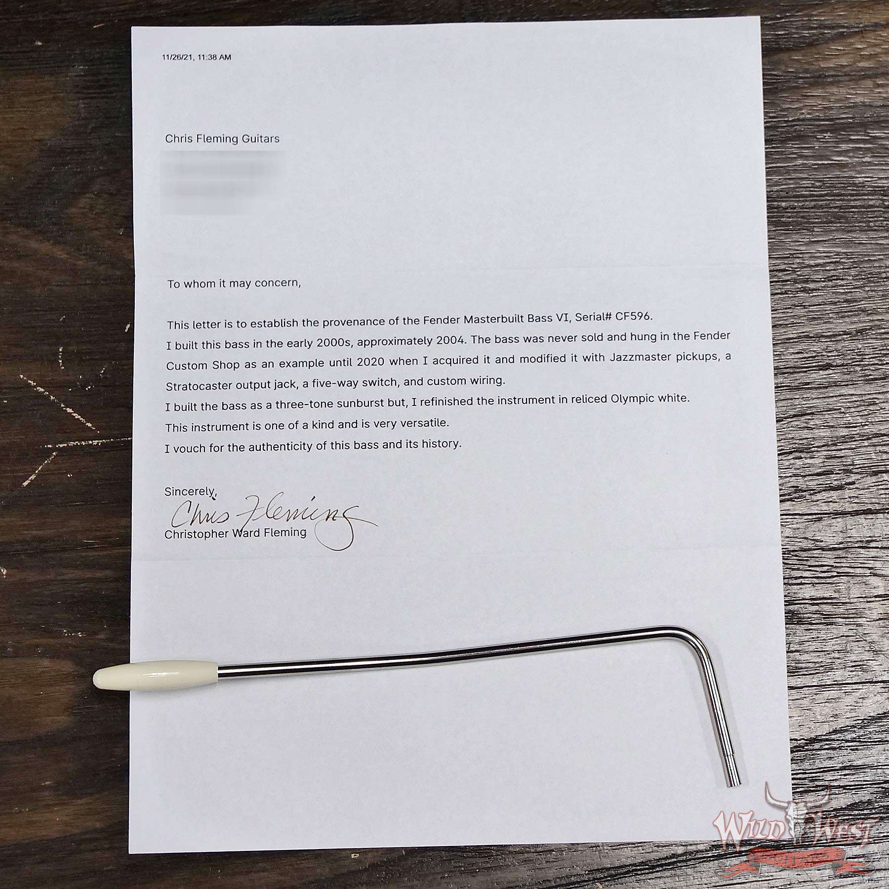 To whom it may concern, This letter is to establish the provenance of the Fender Masterbuilt Bass VI, Serial# CF596. I built this bass in the early 2000s, approximately 2004 (2006 according to Fender Custom Shop records, Wild West Guitars). The bass was never sold and remained on…