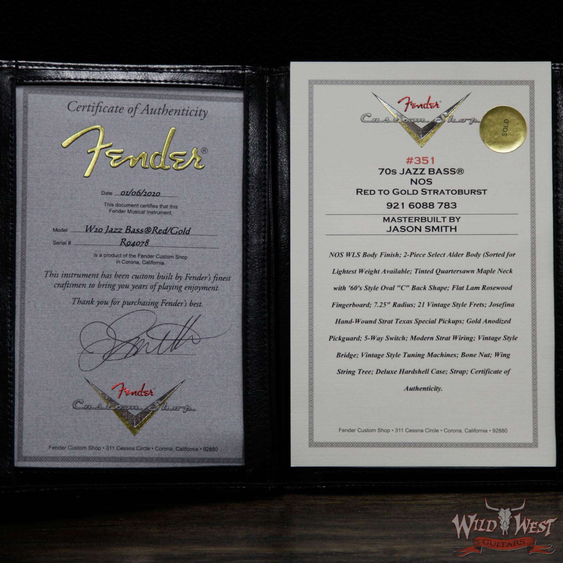 2020 NAMM Fender Custom Shop Jason Smith Masterbuilt 70s Jazz Bass NOS Indian Rosewood Board Red to Gold Stratoburst