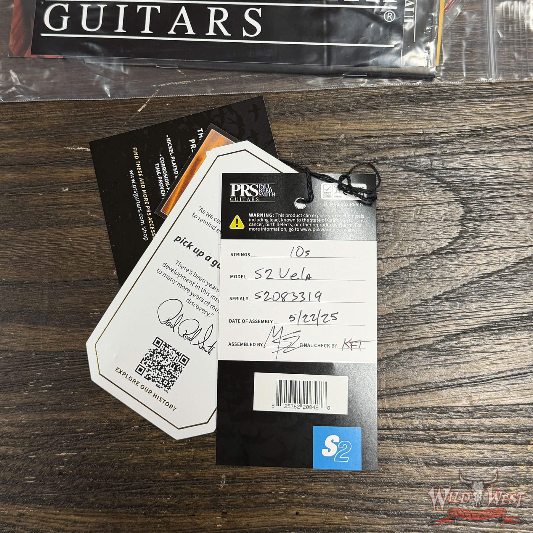 S2 VELA SATIN Simply Irresistible The S2 Vela Satin is a vintage-inspired guitar with loads of personality and tonal textures. The Vela boasts a contemporary offset body shape, and the addition of a thin, satin nitro finish provides added resonance and a truly addictive feel.Its pickguard-loaded electronics feature a PRS DS-01 pickup in the treble pickup position, providing a bright, punky tone, while the PRS Narrowfield in the bass pickup position gives the Vela some noteworthy bite. The coil-tap on the tone control allows the treble pickup to split to single coils, providing additional tonal versatility.Anchoring this guitar is the PRS plate-style bridge with two saddles that were designed to compensate for intonation. This bridge harkens back to Paul’s early designs and traditional bass plate-style bridges but is top-loading for easy restringing. Like the bridge found on Paul’s Guitar and some Private Stock models, PRS’s plate-style bridge features brass saddles and a steel plate for maximum tone.FEATURED SPECIFICATIONS