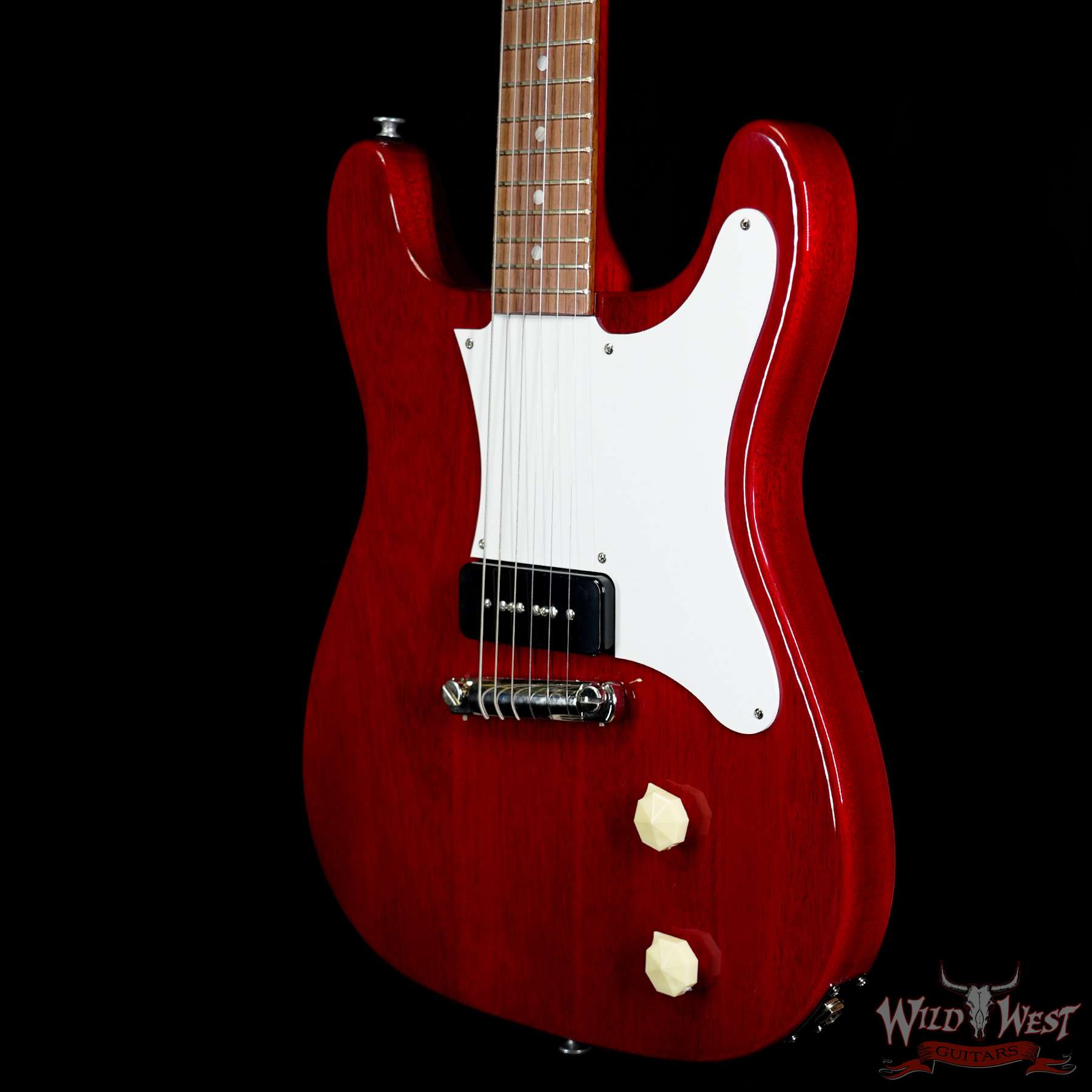 Made in the USA, double cutaway mahogany body, “Bikini” headstock badge, SlimTaper mahogany neck, three on a side headstock, P-90 Soapbar pickup.