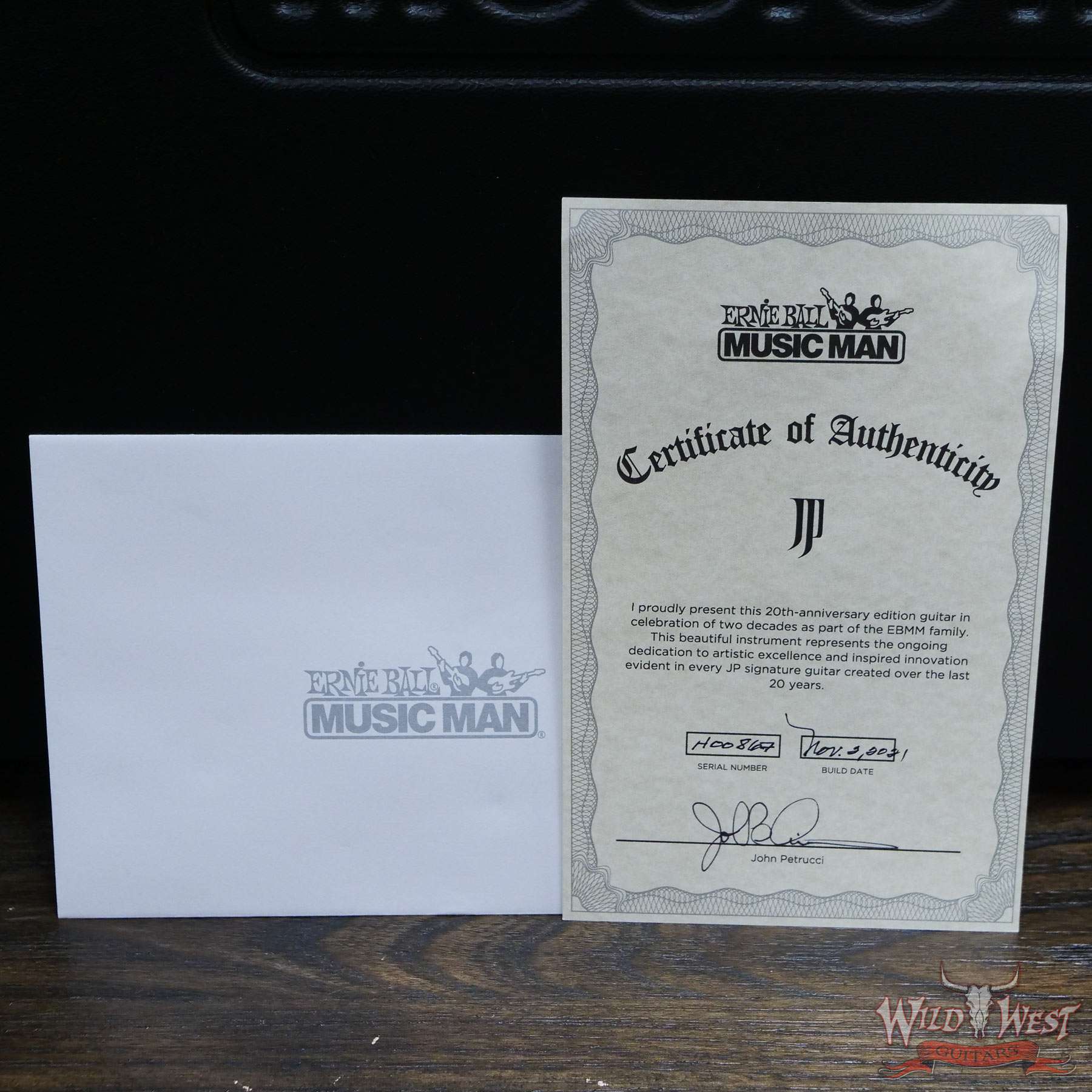 Ernie Ball Music Man and John Petrucci are proud to celebrate a partnership that has lasted for more than two decades, introducing the world to some of the most innovative guitar designs and technology. 2021 marks the 20th anniversary of the John Petrucci line of signature instruments. To honor this achievement, we are pleased to announce a custom limited edition 20th anniversary John Petrucci (JP) signature guitar. The 20th anniversary John Petrucci features a flamed maple top with a forearm scoop seated in a Honey Butter Burst finished Honduran mahogany body. This special signature is equipped with a load of unique options, including a grain-filled Mahogony bolt-on design, an Ebony fretboard with unique gold JP/shield inlays, a combination of gold and black hardware, and a laser-etched anniversary tremolo backplate. The electronics feature signature DiMarzio Crunch Lab (bridge) and Liquifire (neck) pickups combined with a +20db boost preamp and onboard piezo bridge system, giving the JP a focused and highly versatile palette of tones. Available in 6 and 7 string versions, this collectible anniversary guitar comes with an autographed certificate of authenticity and will have a limited ordering window, so make sure to order soon.