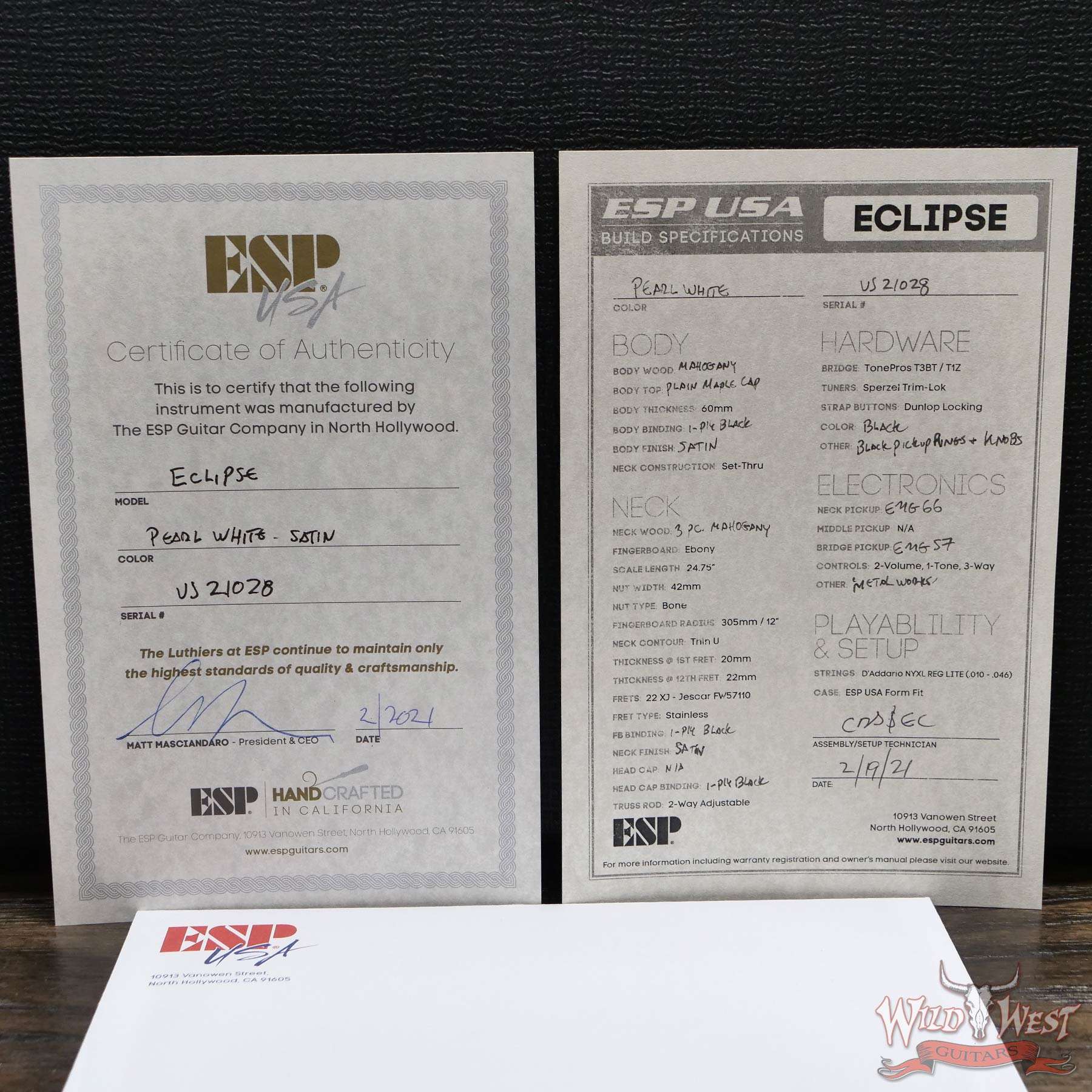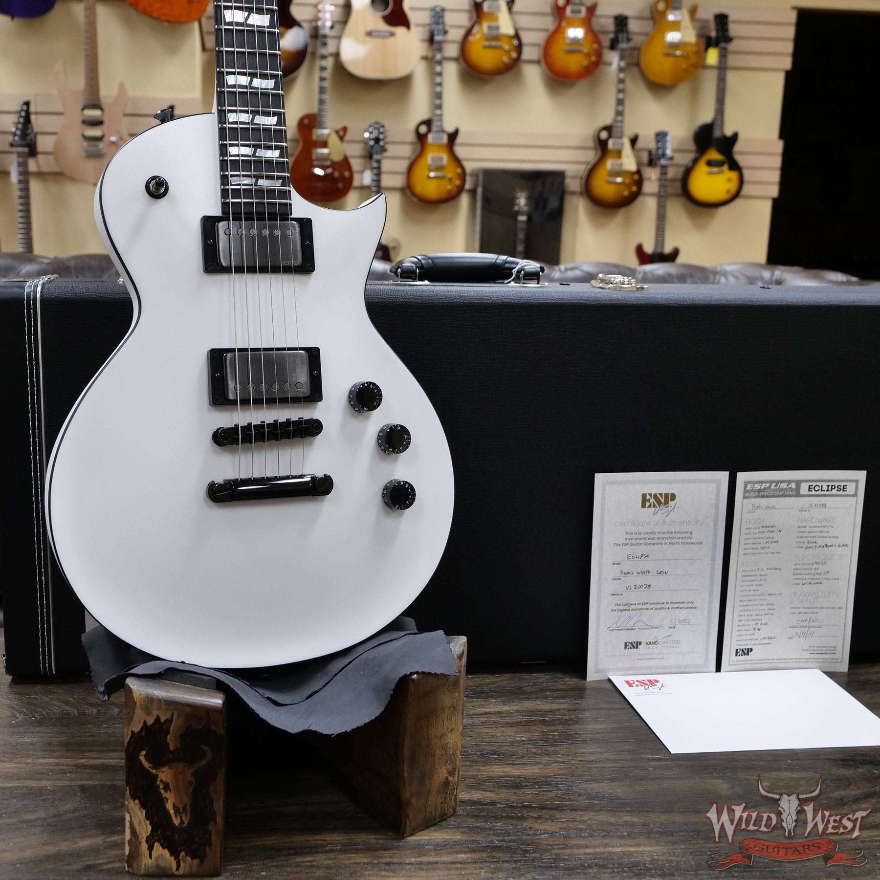 We chose the very best components available for the USA Eclipse, including Sperzel Trim-Lok tuners, TonePros locking TOM bridge and tailpiece, Dunlop strap locks, and a bone nut. Pickups for the USA Eclipse include a variety of world-class Seymour Duncan (passive) and EMG (active) models, with a push-pull coil split control on the tone knob for passive pickup models. The USA Eclipse includes a high-quality ESP USA form-fitting hard shell case.