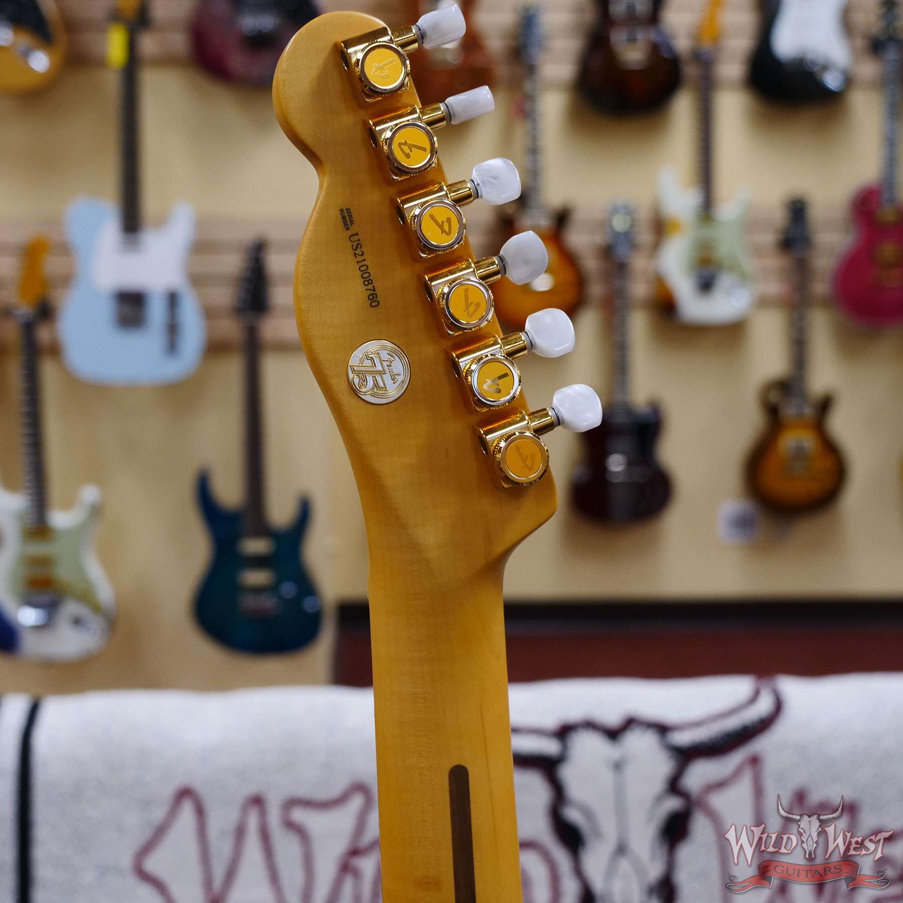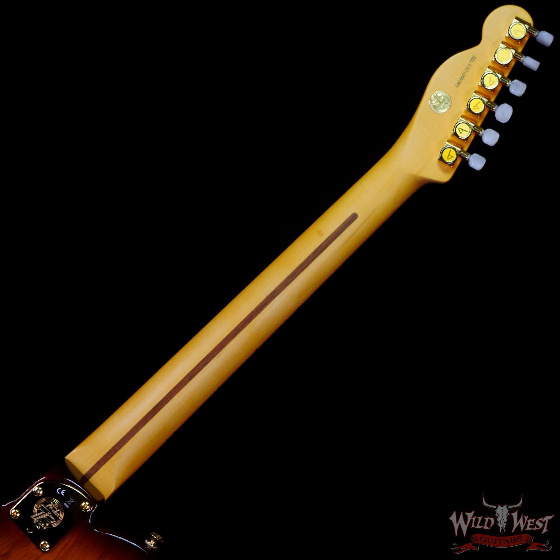 The 75th Anniversary Commemorative Telecaster is decked out in a beautiful 2-Color Bourbon Burst finish over ash body, gold hardware and pearl button locking tuners. The one-piece maple neck features a Deep “C” profile, rolled fingerboard edges, a “Super-Natural” satin finish and a sculpted neck heel for unsurpassed comfort and playability. Custom Shop Twisted Tele pickups deliver searing Telecaster twang with sparkle and clarity. A top-load/string- through bridge with compensated “bullet” saddles provides superb intonation and versatility. Finally, every Commemorative Telecaster features special badging with a 75th anniversary ingot inlaid into the back of the headstock and an engraved anniversary neck plate.
