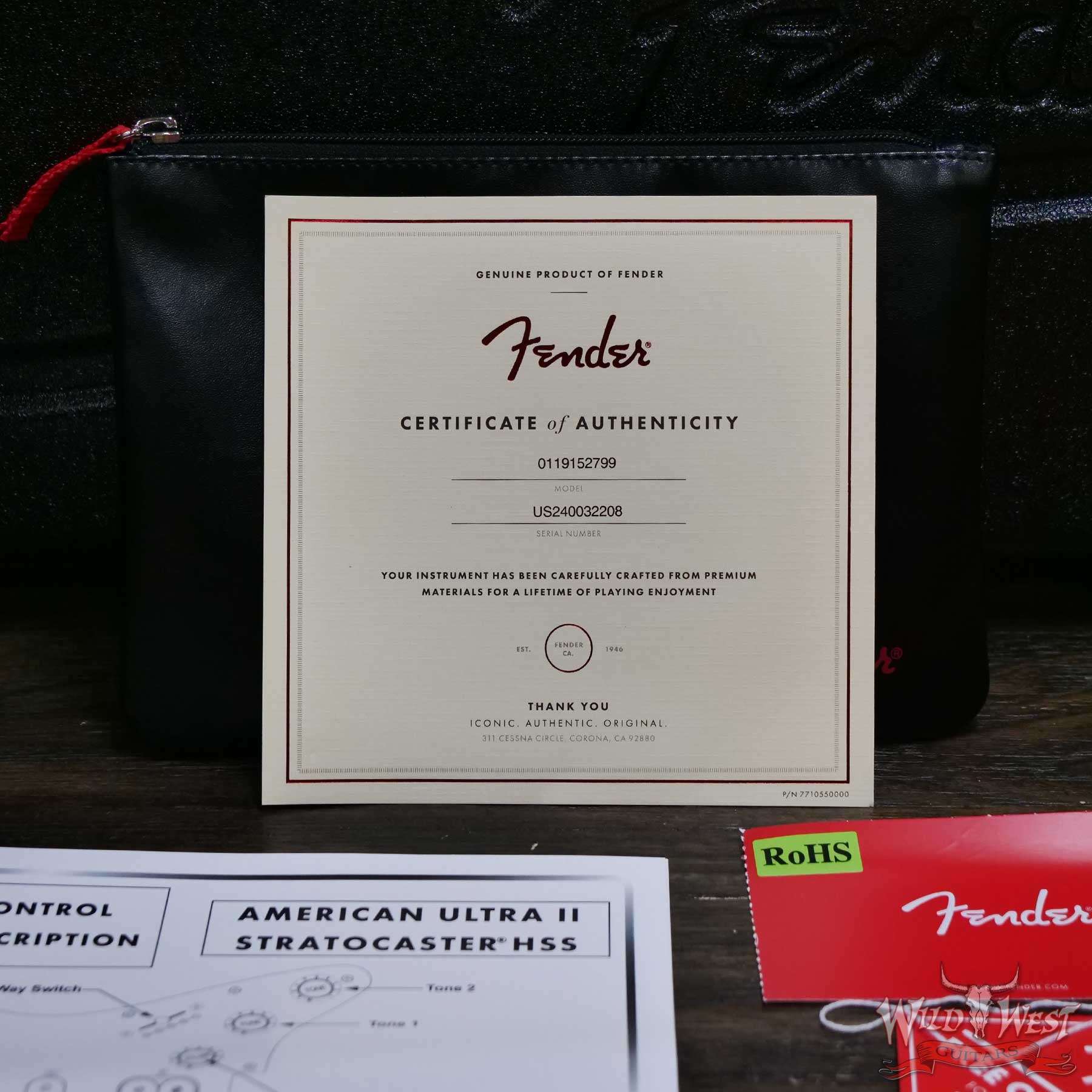 The Fender® American Ultra II Stratocaster® HSS features a select alder body with sculpted body contours. For effortless playability, the quartersawn maple neck features our Modern D profile and smooth Ultra Satin finish. Ebony or quartersawn maple 10”-14” compound radius fingerboards feature Ultra rolled edges, medium-jumbo frets, Luminlay® side dots and Graph Tech® TUSQ® nuts. The tapered neck heel and sculpted body contours allow unparalleled access to the higher register.