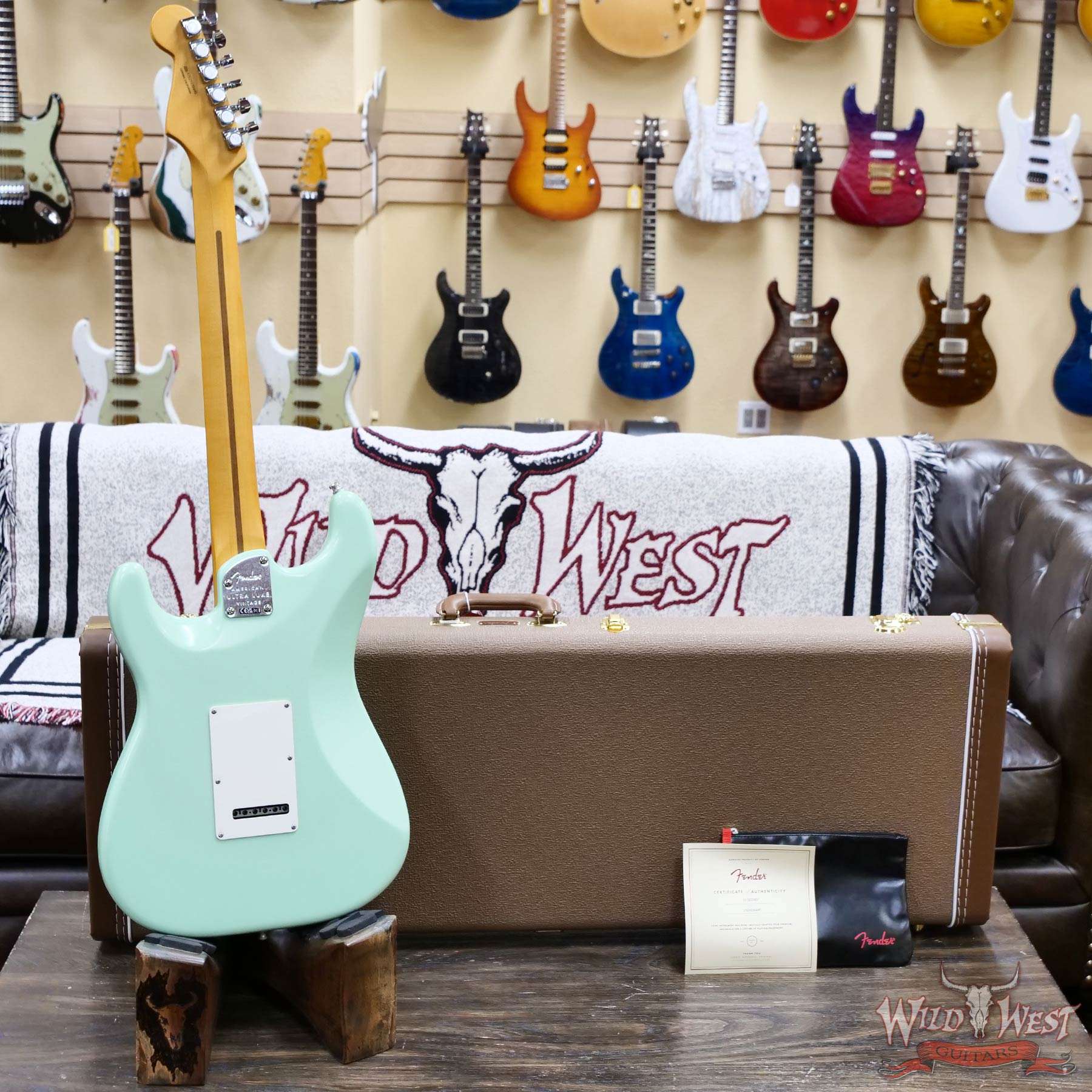 - AMERICAN ULTRA SYNCHRONIZED TREMOLO, STAINLESS STEEL SADDLES, COLD ROLLED STEEL BLOCK, POP-IN ARM