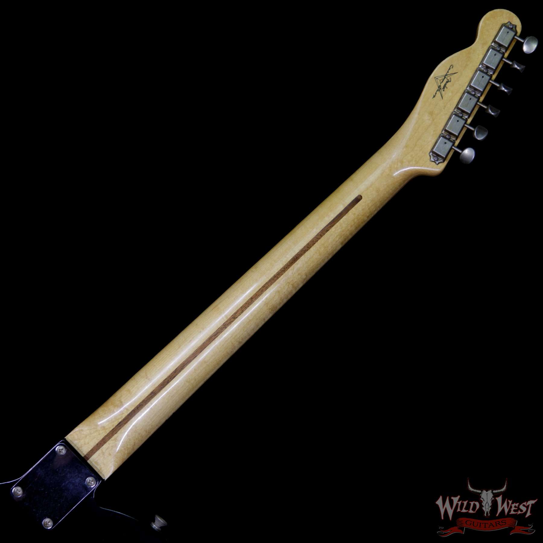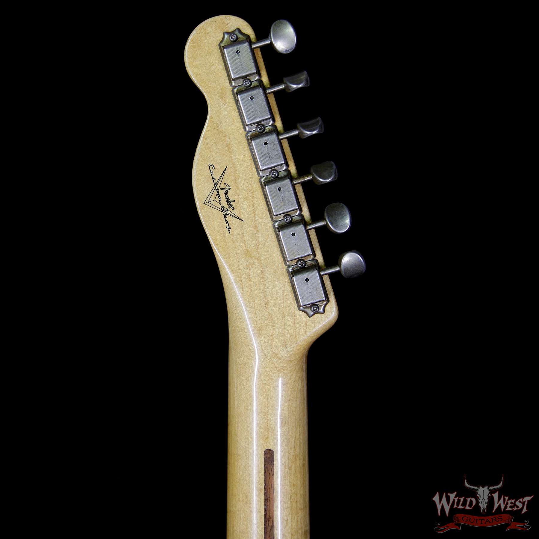 The Wild West version of the Fender Custom Shop ’52 Telecaster Relic runs quick-and-nimble with her streamlined U carve neck (.860-.920 depth at the first and 12th frets), 9.5 radius and medium jumbo fretwire leading the way to dirty-neck paradise. The streamlined U carve provides a more tapered feel, as opposed to the large, club style of the traditional Fender Cst Shop ’52 U carve, which is .999-.999 depth at the first and 12th frets. The twisted tele neck/broadcaster bridge pickup combination brings plenty of spark, spank, crunch and punch to the party in a big way. Benchmark, woody, sort-for-lightweight-ash-body tonality abounds! Run lean and mean with the Fender ’52 streamline U rock machine.