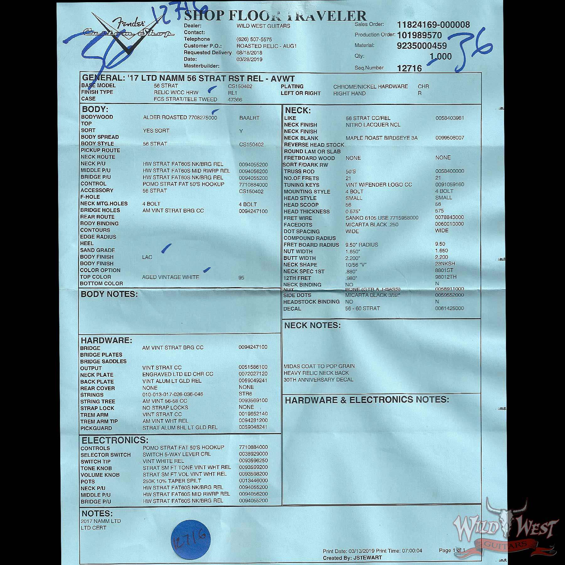 Fender Custom Shop 1956 Roasted Stratocaster Relic AAA Birdseye Maple Neck & Fingerboard Aged Vintage White