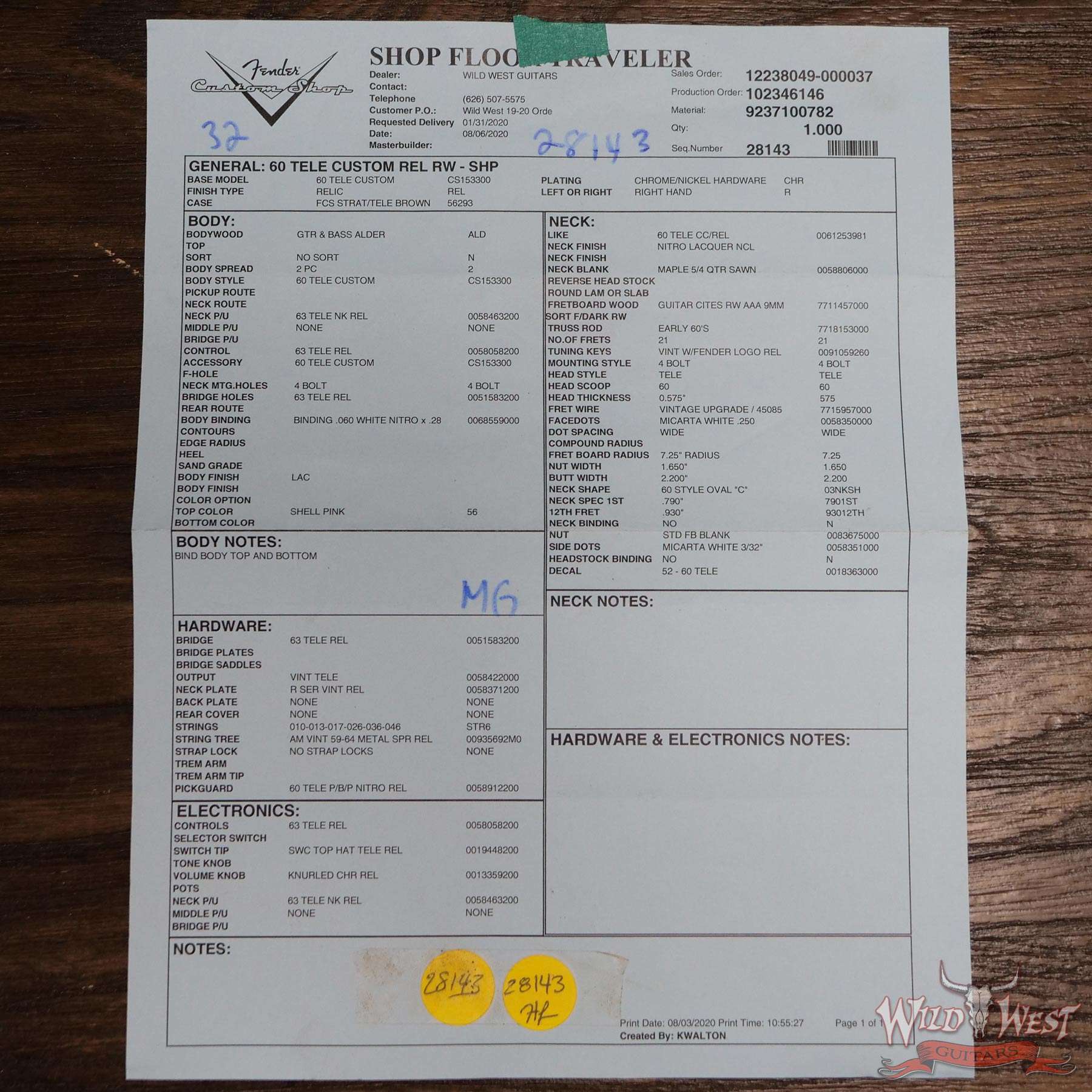 Fender Custom Shop 1960 Telecaster Custom Relic Quater-Sawn Maple AAA Rosewood Fingerboard Shell Pink