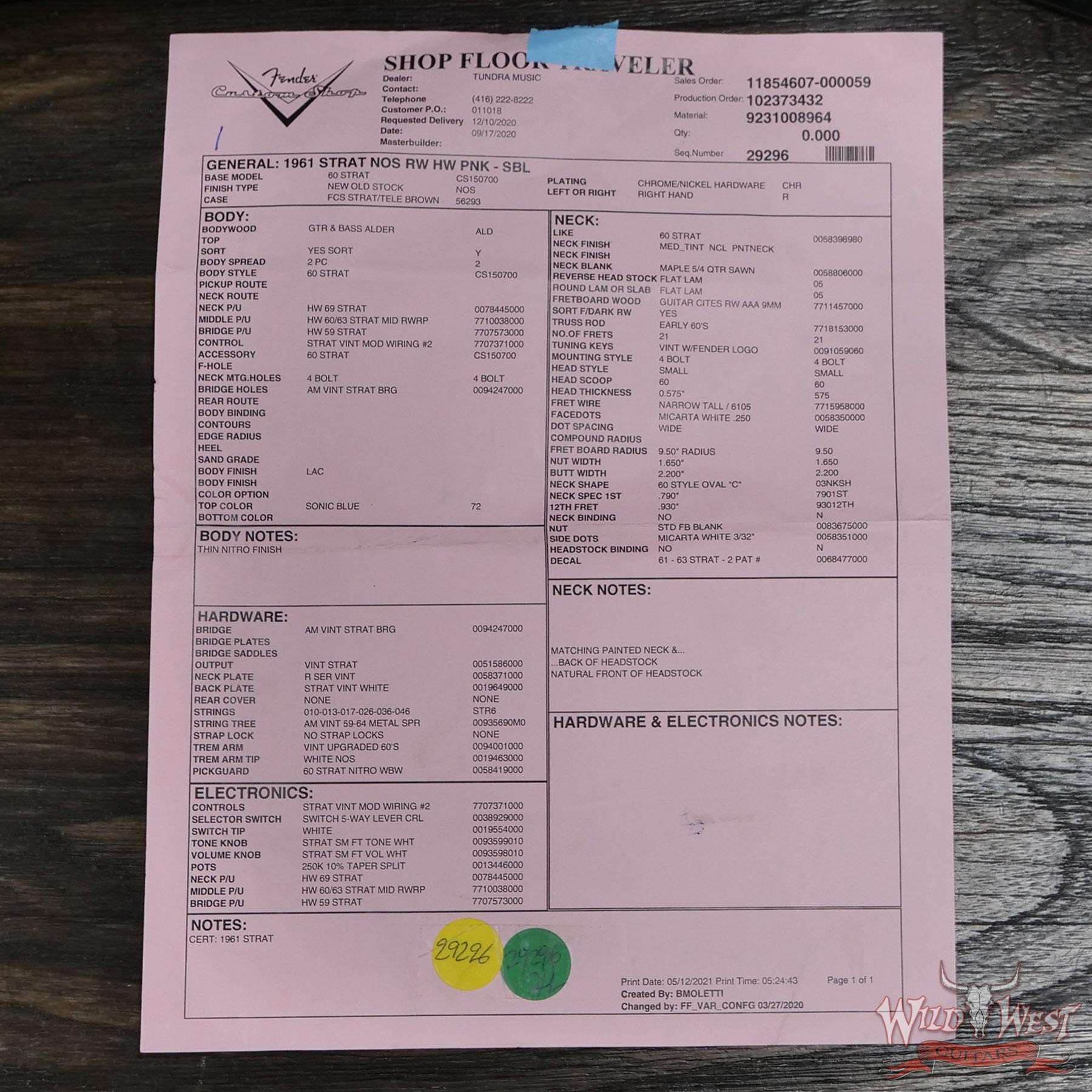 Fender Custom Shop 1961 Stratocaster NOS Hand-Wound Pickups Matching Color Neck Sonic Blue