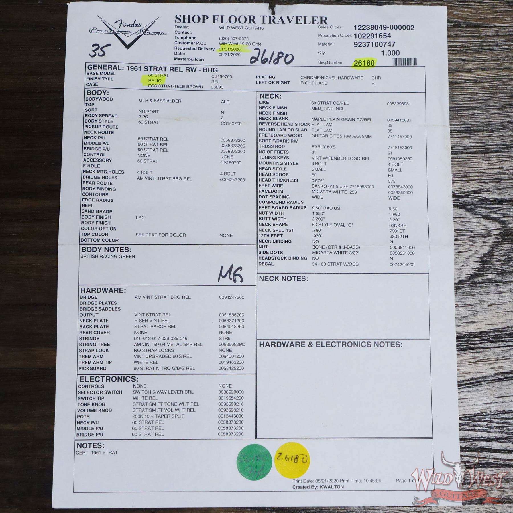 Fender Custom Shop 1961 Stratocaster Relic AAA Rosewood Slab Board Maple Neck British Racing Green
