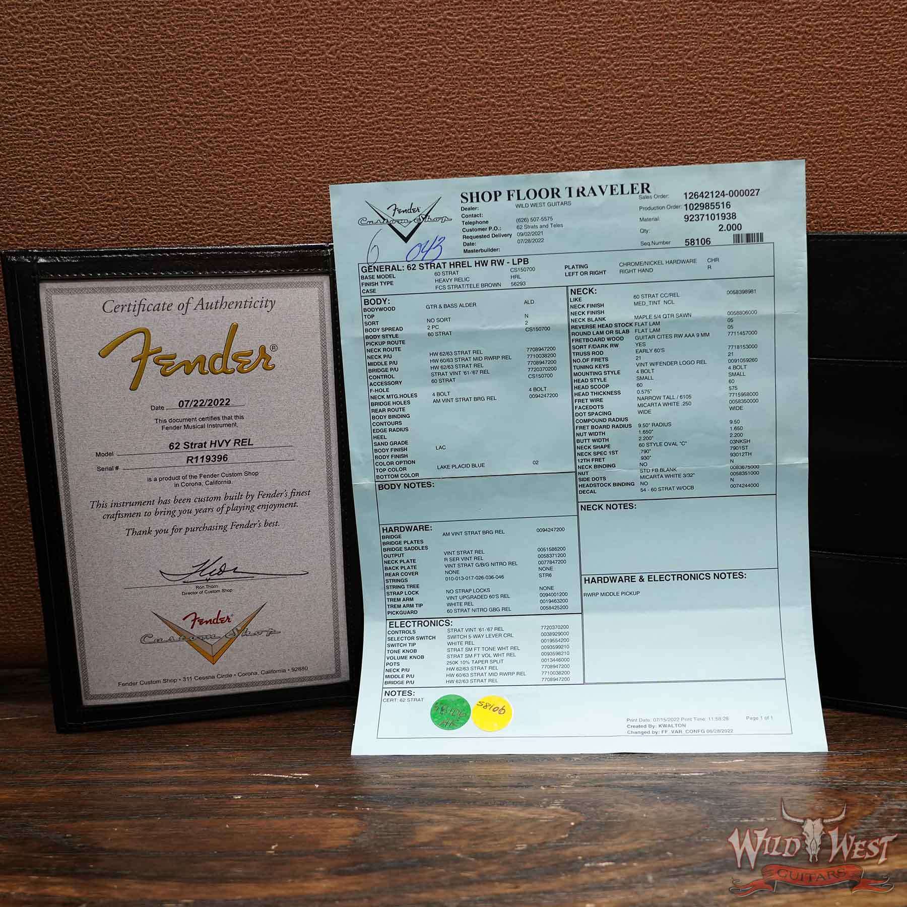 Fender Custom Shop 1962 Stratocaster Hand-Wound Pickups AAA Dark Rosewood Slab Board Heavy Relic Lake Placid Blue 7.90