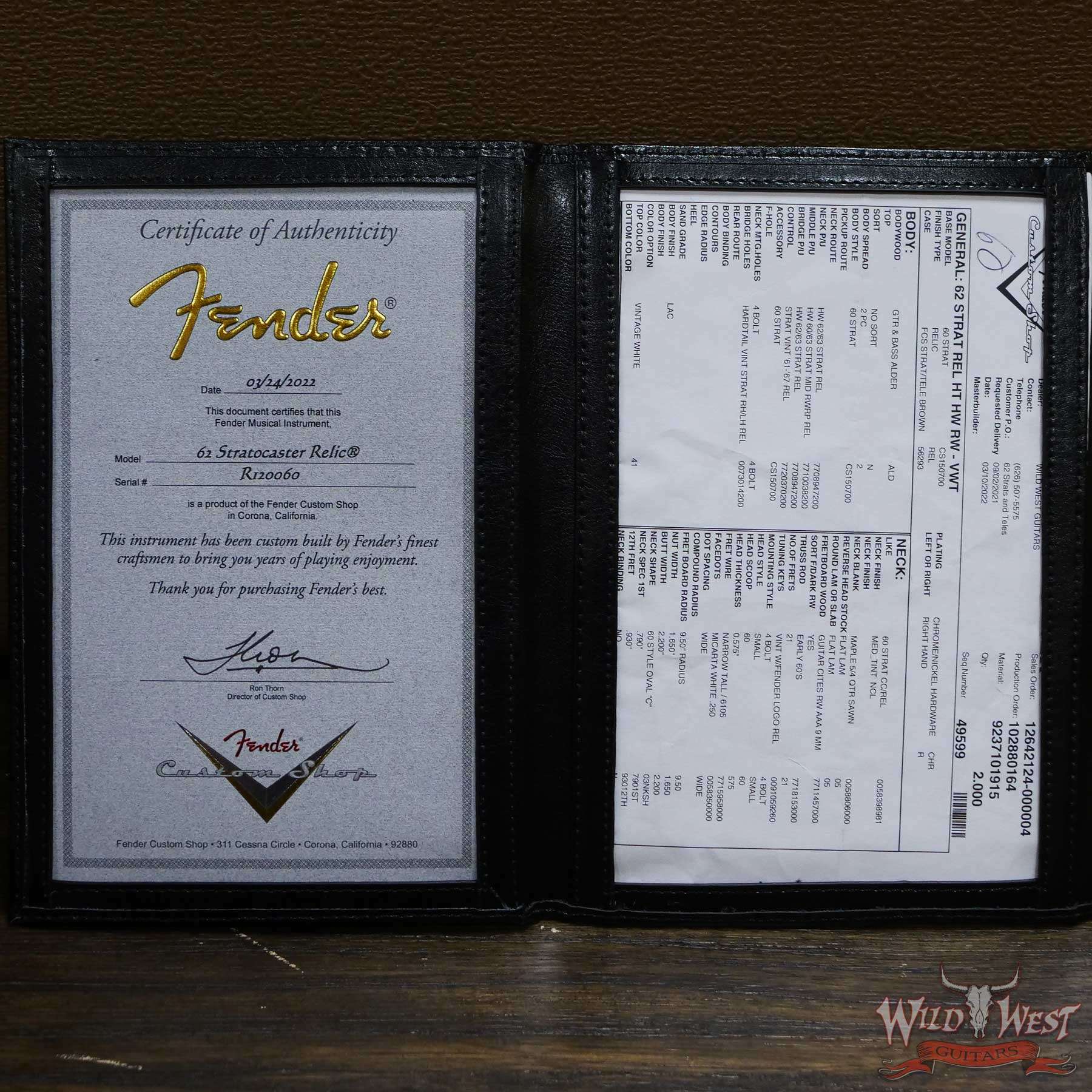 Fender Custom Shop 1962 Stratocaster Hardtail Hand-Wound Pickups AAA Dark Rosewood Slab Board Relic Vintage White 6.70 LBS