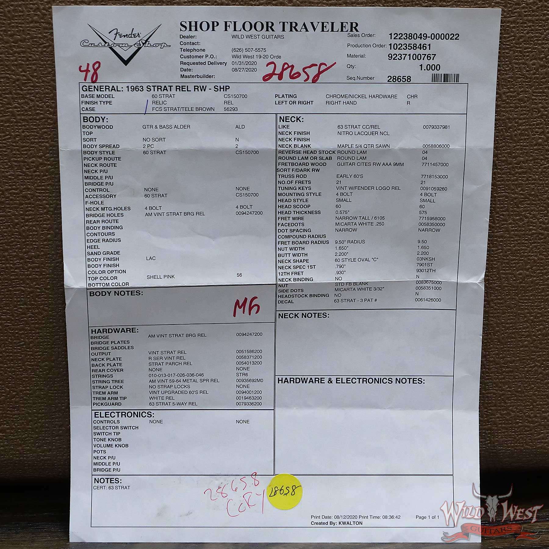 Fender Custom Shop 1963 Stratocaster Relic AAA Rosewood Board with Quartersawn Maple Neck Shell Pink