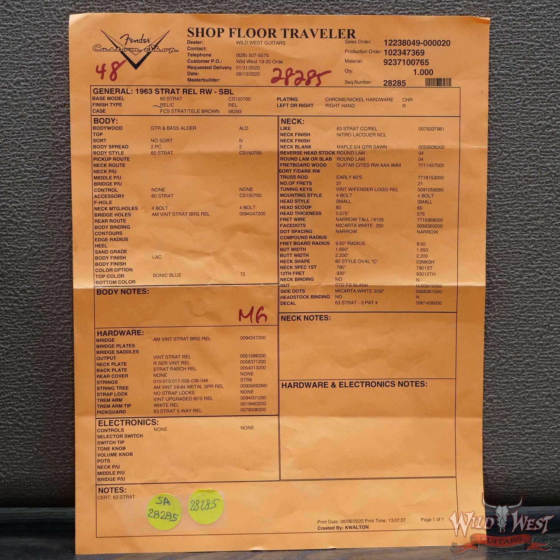 Fender Custom Shop 1963 Stratocaster Relic AAA Rosewood Board with Quartersawn Maple Neck Sonic Blue