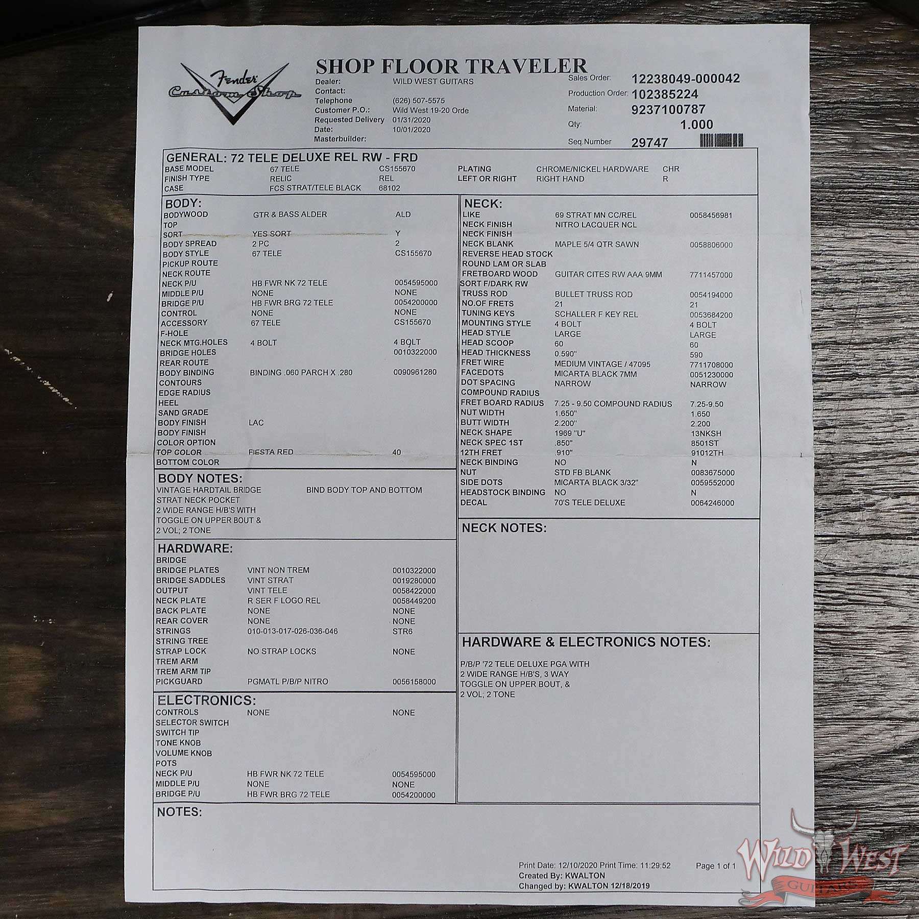 Fender Custom Shop 1972 Telecaster Deluxe Relic HH Quatersawn Maple Neck AAA Rosewood Board Fiesta Red