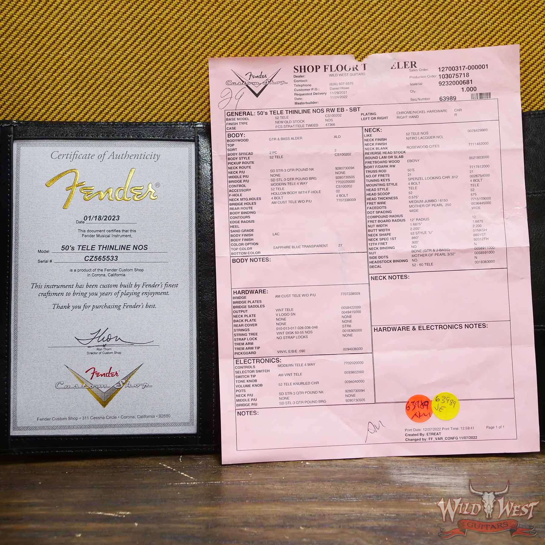 Fender Custom Shop 50’s Telecaster Thinline Rosewood Neck Ebony Fingerboard NOS Sapphire Blue Transparent