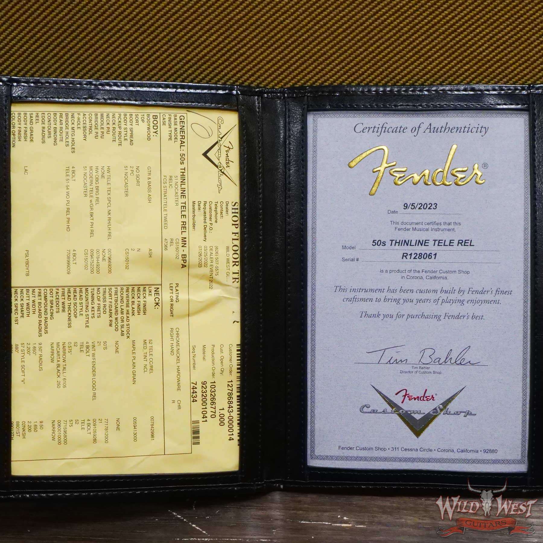Relic® Lacquer Finish; 2 Piece Select Ash Body; 1-Piece Quartersawn Maple Neck with ‘57 Style Soft “V” Back-Shape; 9.5” Radius; Narrow Tall (6105) Frets; Hand-Wound Original Blackguard Tele® (Bridge) and Texas Special™ Tele (Neck) Pickups; Modern Tele Wiring with Greasebucket™ Tone; 3-Way Switch; Single-Ply Parchment Pickguard; ‘51-‘54 Tele Bridge with Brass Barrel Saddles; Vintage-Style Tuning Machines; Bone Nut; Disc String Tree; Deluxe Hardshell Case; Strap; Certificate of Authenticity.