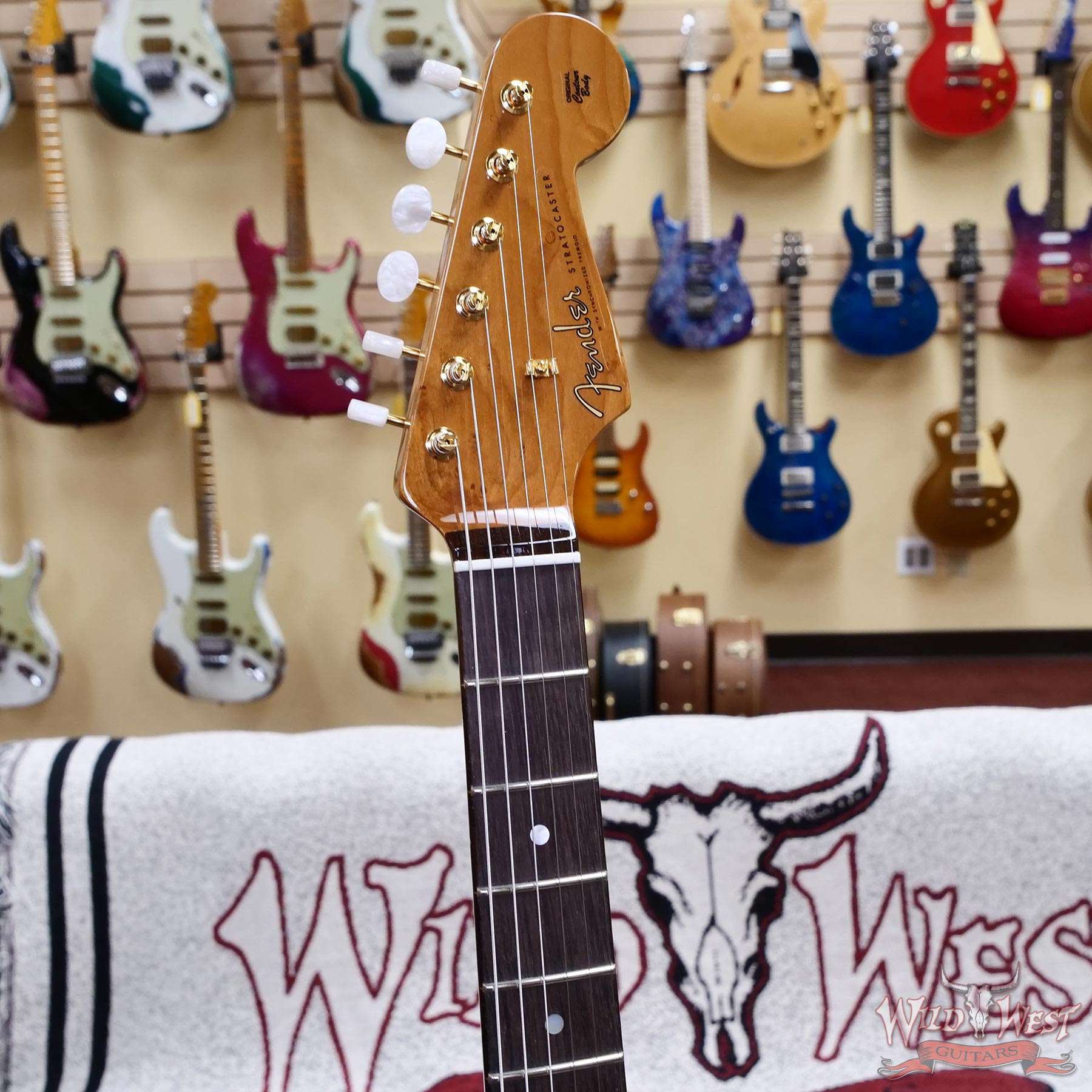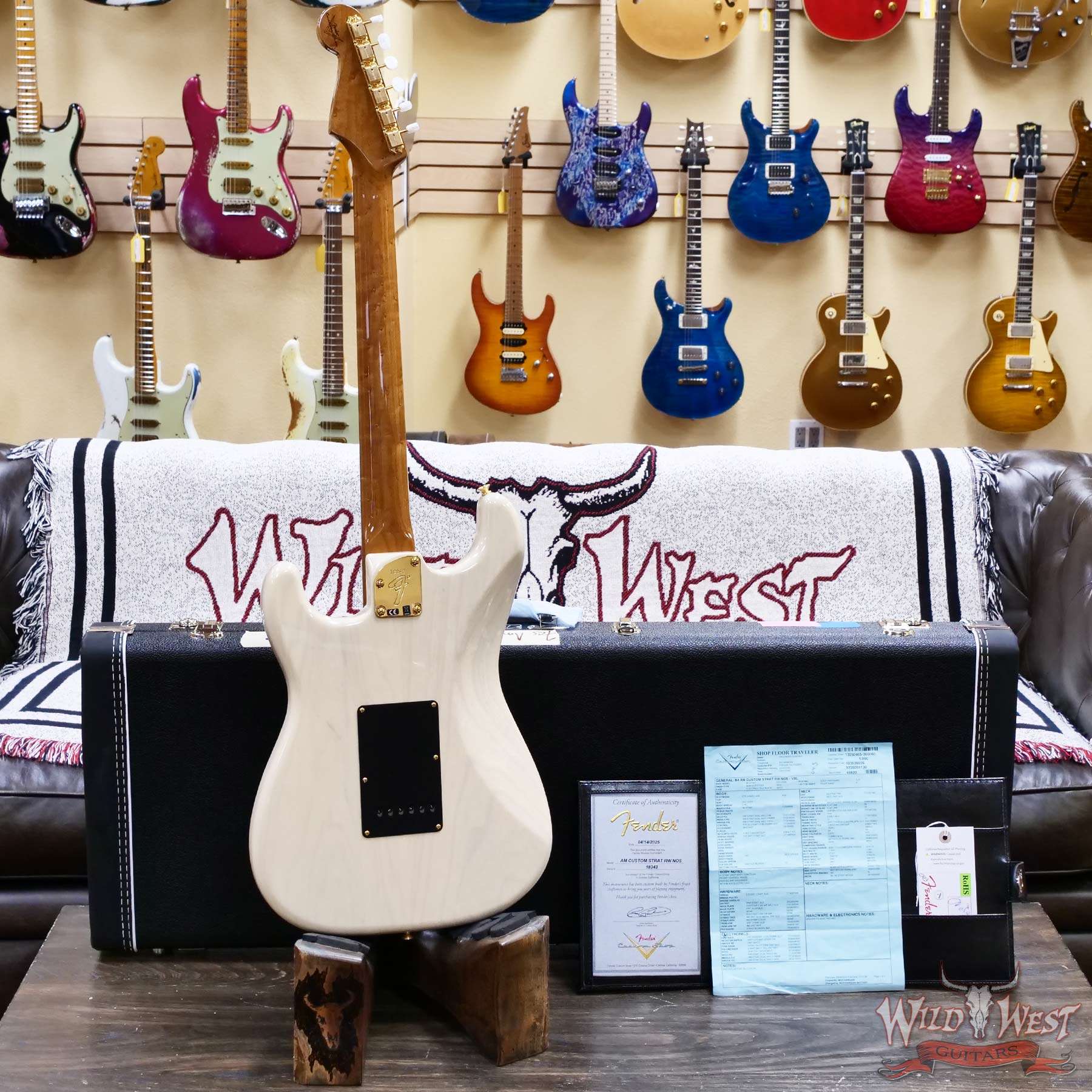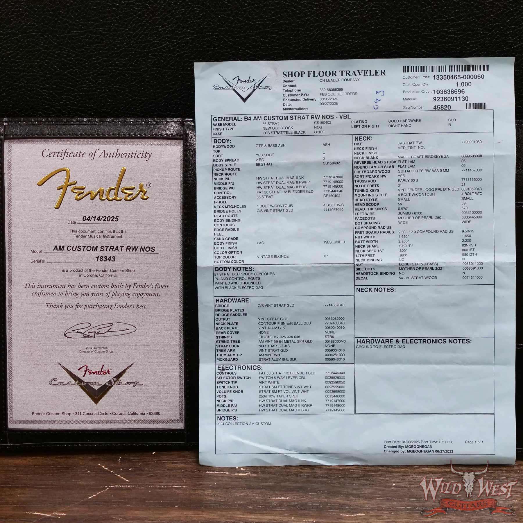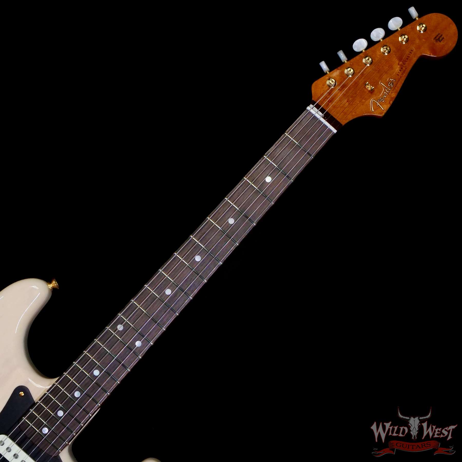 NOS Lacquer Finish with Gold Hardware; 2-Piece Select Ash Body; 2A Roasted Birdseye Maple Neck with ‘59 Style “D” Back-Shape; Contoured Heel; Flat-Lam Rosewood Fingerboard; 9.5” to 12” Compound Radius; 21 Jumbo (6100) Frets; Custom Shop Hand-Wound Dual-Mag II Strat® Pickups; Fat ‘50s 1/2 Blender Strat Wiring; 5-Way Switch; Black Anodized Aluminum Pickguard; Custom Shop Vintage Synchronized Tremolo; Vintage-Style Tuning Machines with White Pearloid Buttons; Bone Nut; Wing String Tree with Tall Metal Spacer; Deluxe Hardshell Case; Strap; Certificate of Authenticity.