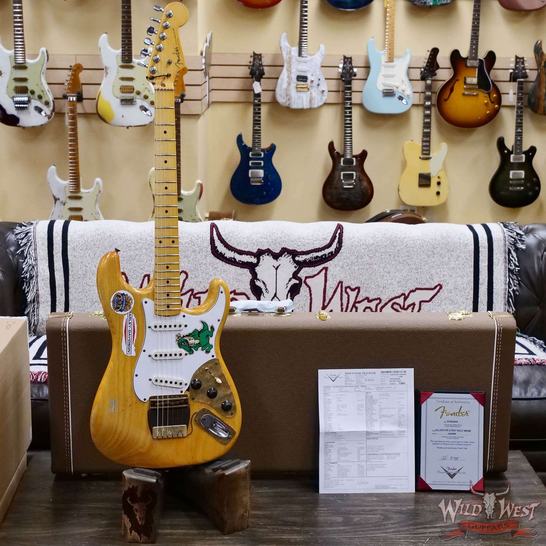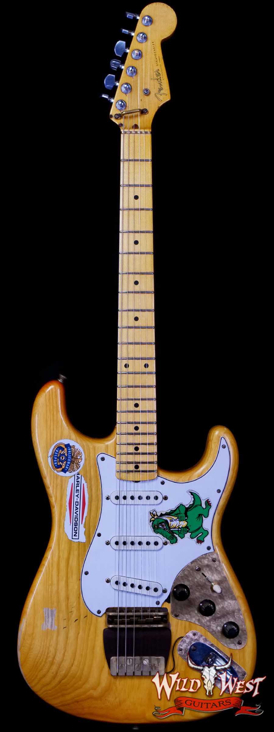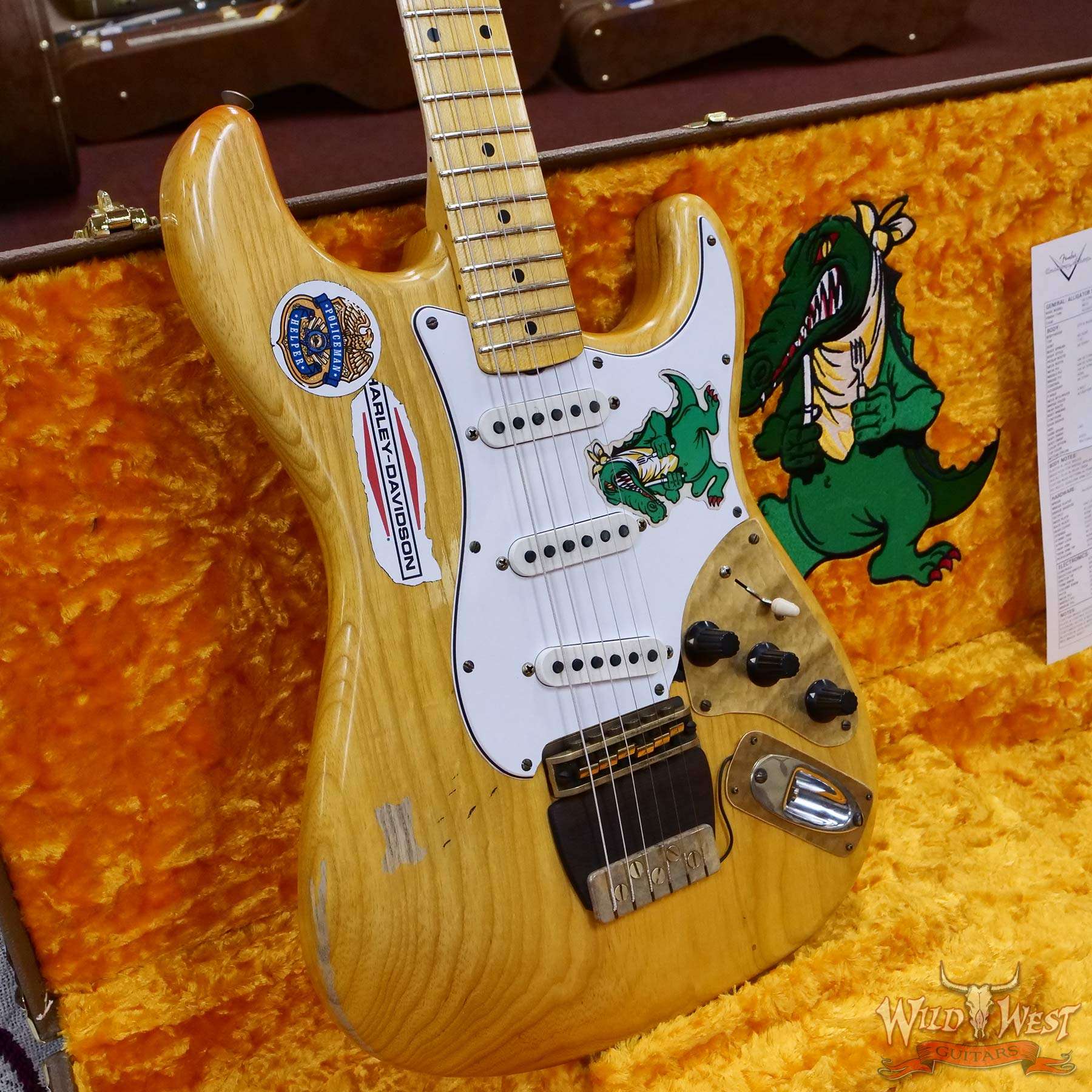 All three pickups are Josefina hand-wound ‘55-style single-coil Stratocaster pickups replicated from the Alligator itself, along with five-way switching, standard vintage Stratocaster wiring and replica “hat” control knobs on a three-ply parchment pickguard. Premium features also include a Relic® lacquer finish, one-piece rift-sawn maple neck with a profile scanned and replicated directly from the original guitar, 7.25” fingerboard radius and 1.625” brass nut width, 21 Medium Vintage frets, custom brass bridge and tailpiece with rosewood base plate, Schaller® M6 tuners, disc string tree with custom retainer bar, and custom birdseye maple back plate. Custom hardshell case included.