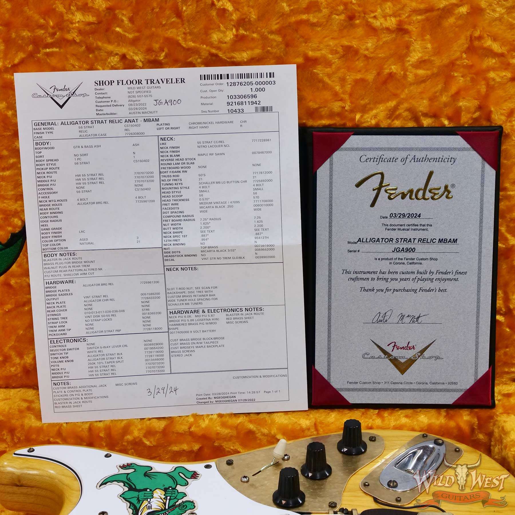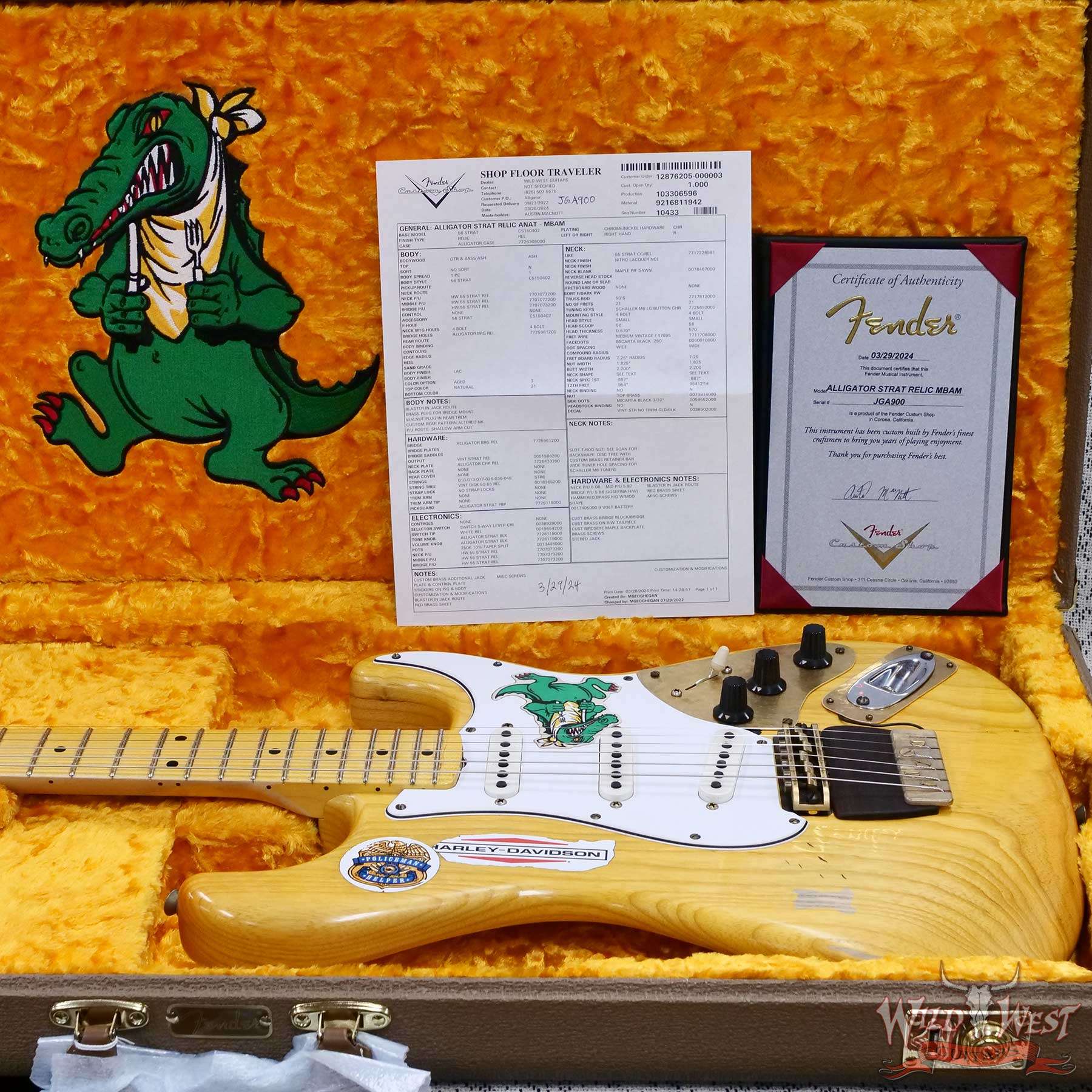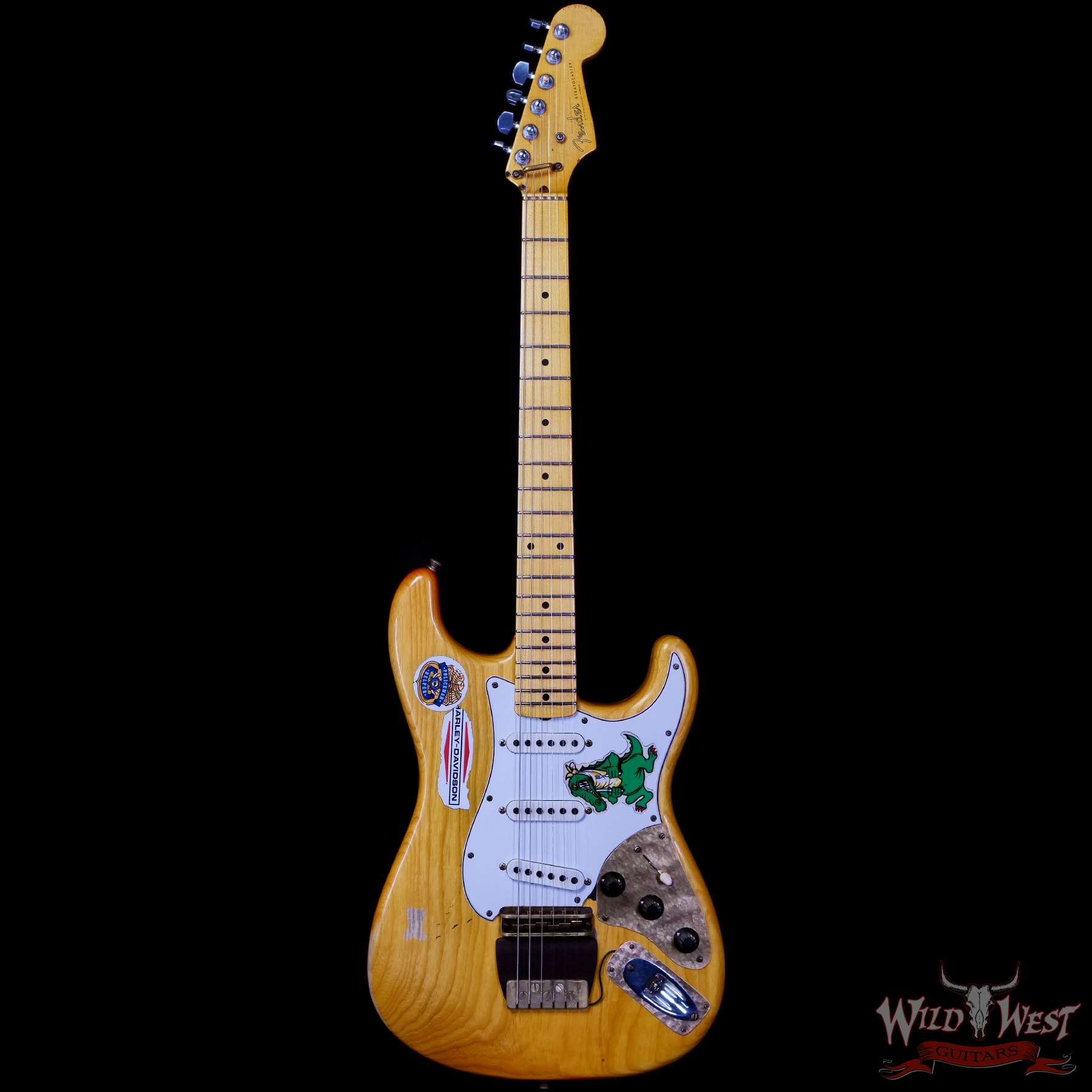 All three pickups are Josefina hand-wound ‘55-style single-coil Stratocaster pickups replicated from the Alligator itself, along with five-way switching, standard vintage Stratocaster wiring and replica “hat” control knobs on a three-ply parchment pickguard. Premium features also include a Relic® lacquer finish, one-piece rift-sawn maple neck with a profile scanned and replicated directly from the original guitar, 7.25” fingerboard radius and 1.625” brass nut width, 21 Medium Vintage frets, custom brass bridge and tailpiece with rosewood base plate, Schaller® M6 tuners, disc string tree with custom retainer bar, and custom birdseye maple back plate. Custom hardshell case included.