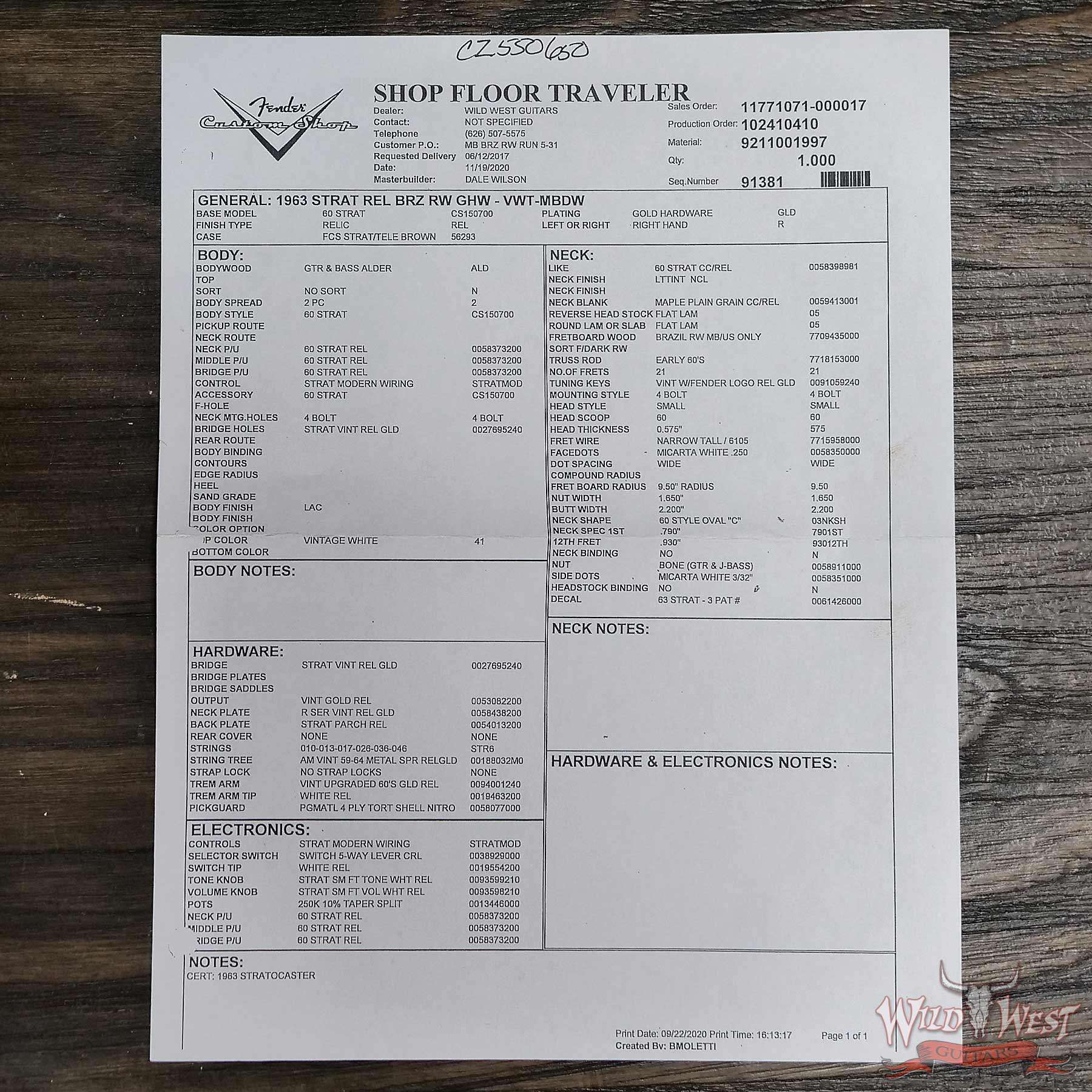 Fender Custom Shop Dale Wilson Masterbuilt 1963 Stratocaster Brazilian Rosewood Slab Board Relic Vintage White