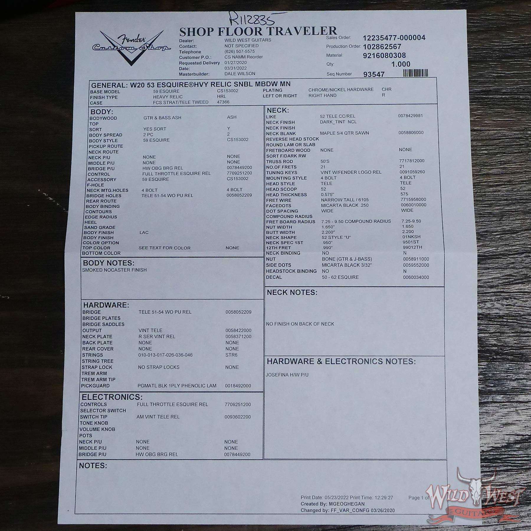 Fender Custom Shop Dale Wilson Masterbuilt 53′ Esquire Josefina H/W OBG Pickup Heavy Relic Smoked Nocaster Blonde