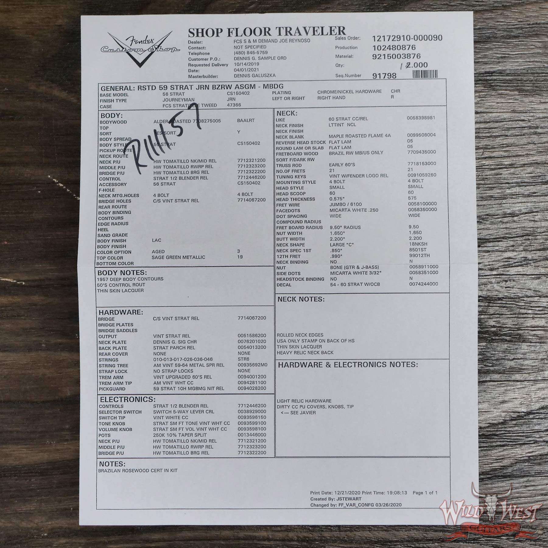 Fender Custom Shop Dennis Galuszka Masterbuilt Roasted 1959 Stratocaster Brazilian Rosewood Slab Board Hand-Wound PUs Journeyman Relic Aged Sage Green Metallic