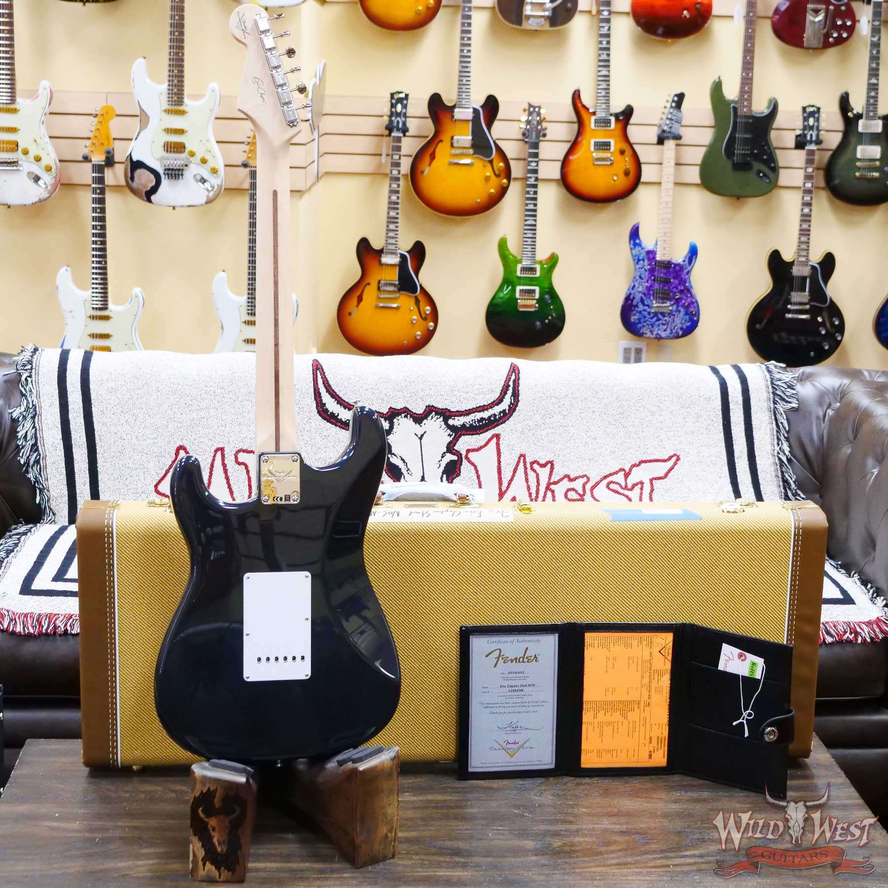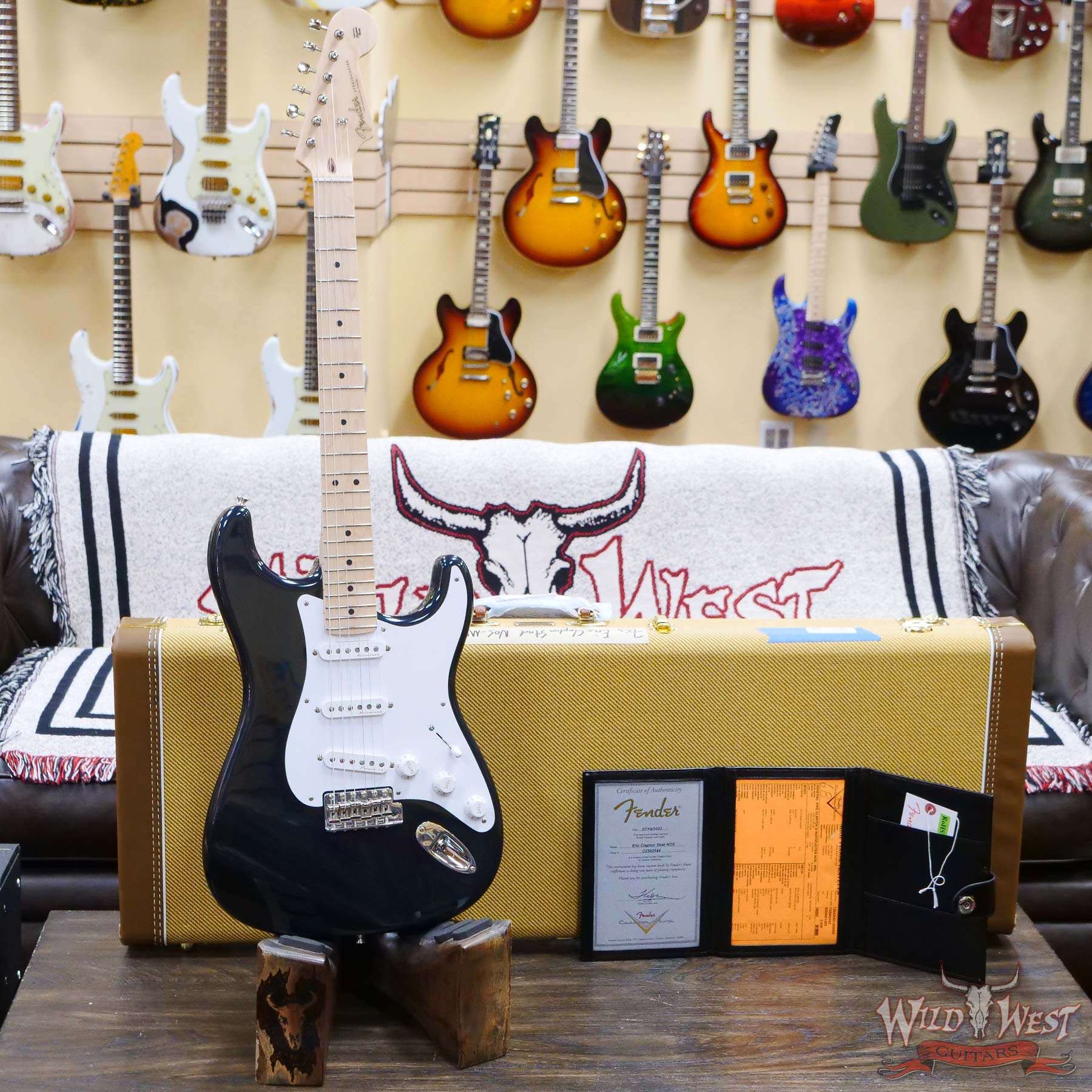 Built to Clapton’s specs, the Custom Shop Eric Clapton Signature Stratocaster® guitar features an alder body, special soft V-shaped maple neck, three Vintage Noiseless™ pickups, blocked tremolo and Clapton’s signature on the headstock.