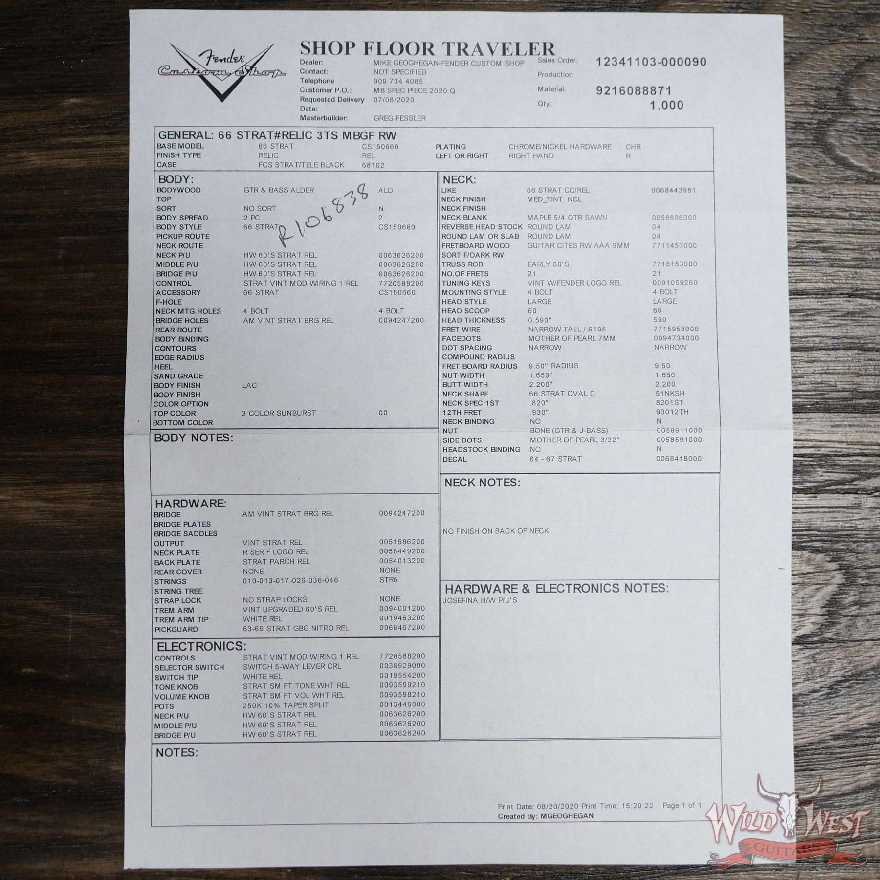 ModelFender Custom Shop Greg Fessler Maserbuilt 1966 Stratocaster Relic 3 Tone Sunburst Josefina Hand-Wound Pickups