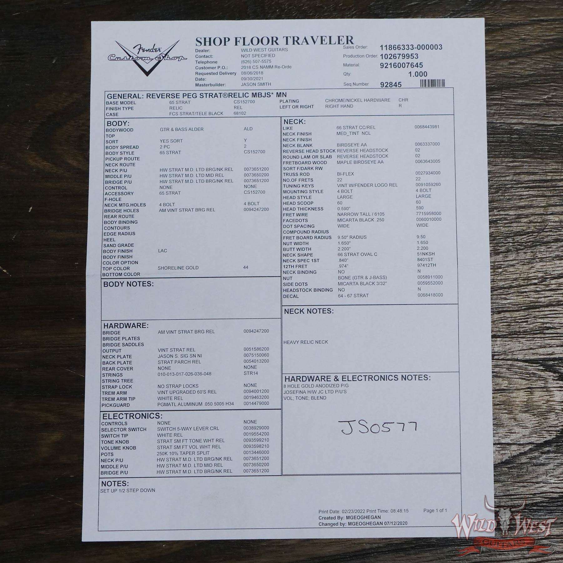 Fender Custom Shop Jason Smith Masterbuilt 1965 Stratocaster Maple Neck Reverse Headstock Relic Shoreline Gold