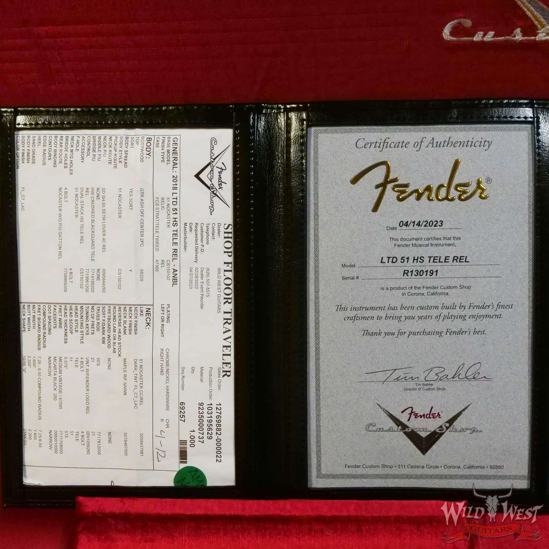 Relic® Flash Coat Lacquer Finish; 2-Piece Offset Seam Ash Body; Rift Sawn Maple Neck with a 10/56 “V” Back-Shape; 7.25” to 9.5” Vintage Compound Radius; 21 Medium Vintage (47095) Frets; Hand-Wound ‘50-‘51 “Crushed” Blackguard Tele® (Bridge) and Seymour Duncan® SH55 Seth Lover (Neck) Pickups; Dual Stack HS Tele Wiring; 3-Way Switch; Single-Ply Black Phenolic Pickguard; ‘51 Nocaster® Bridge with Gatton Saddles; Vintage-Style Tuning Machines; Bone Nut; Disc String Tree; Deluxe Hardshell Case; Strap; Certificate of Authenticity.