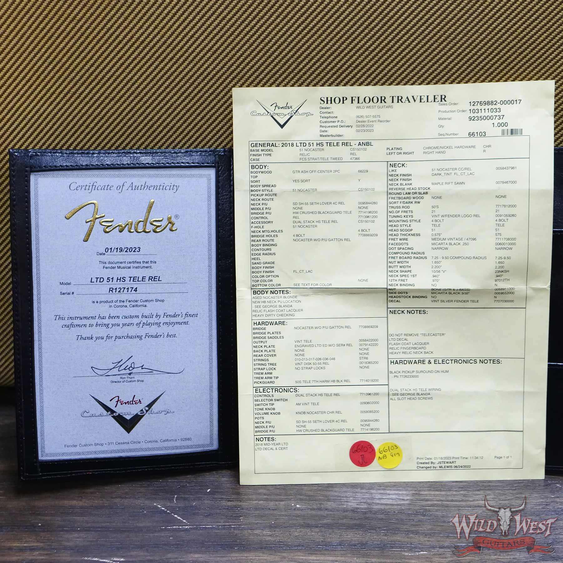 Relic® Flash Coat Lacquer Finish; 2-Piece Offset Seam Ash Body; Rift Sawn Maple Neck with a 10/56 “V” Back-Shape; 7.25” to 9.5” Vintage Compound Radius; 21 Medium Vintage (47095) Frets; Hand-Wound ‘50-‘51 “Crushed” Blackguard Tele® (Bridge) and Seymour Duncan® SH55 Seth Lover (Neck) Pickups; Dual Stack HS Tele Wiring; 3-Way Switch; Single-Ply Black Phenolic Pickguard; ‘51 Nocaster® Bridge with Gatton Saddles; Vintage-Style Tuning Machines; Bone Nut; Disc String Tree; Deluxe Hardshell Case; Strap; Certificate of Authenticity.