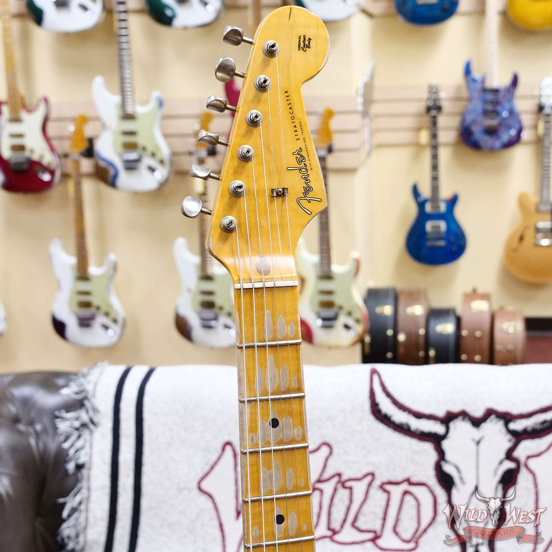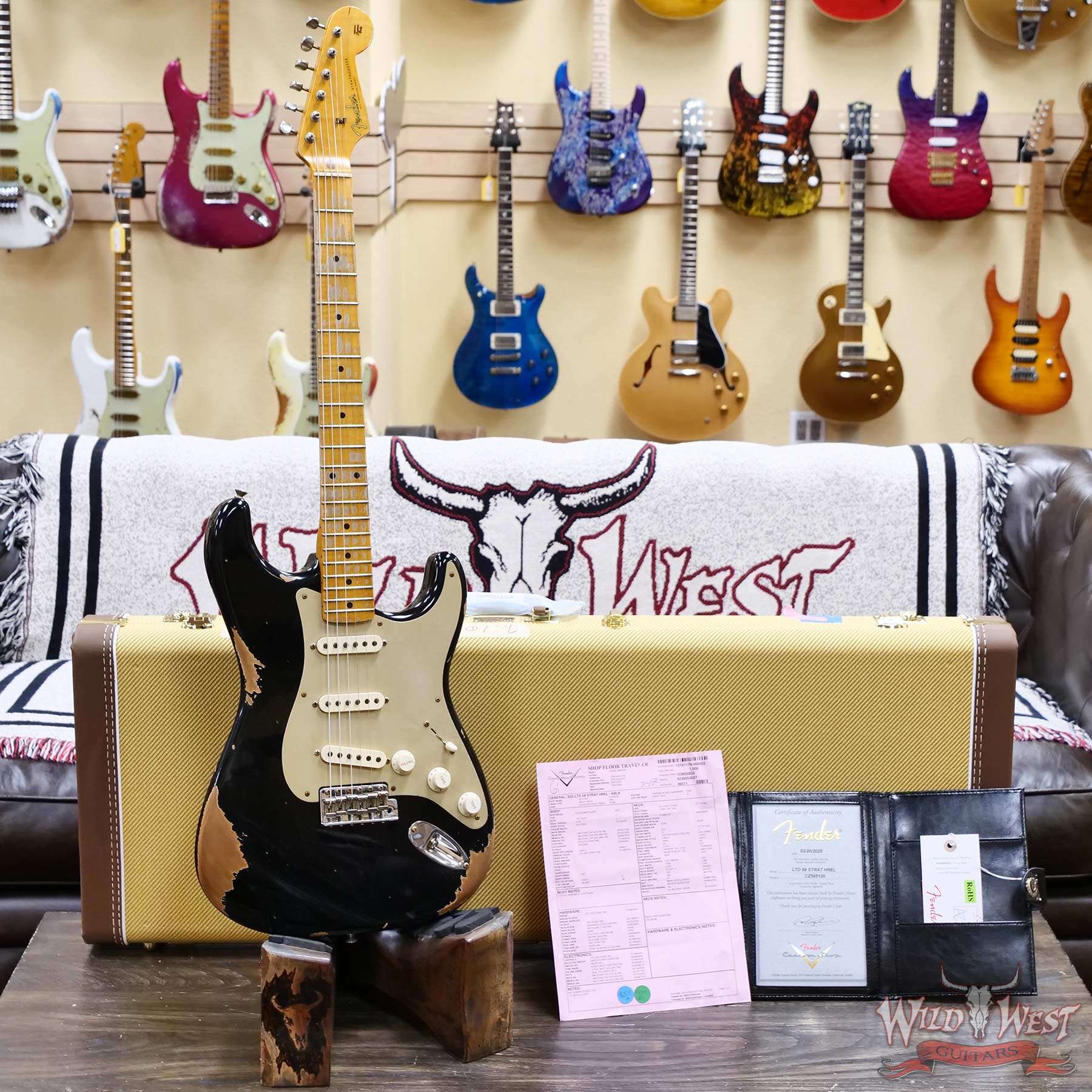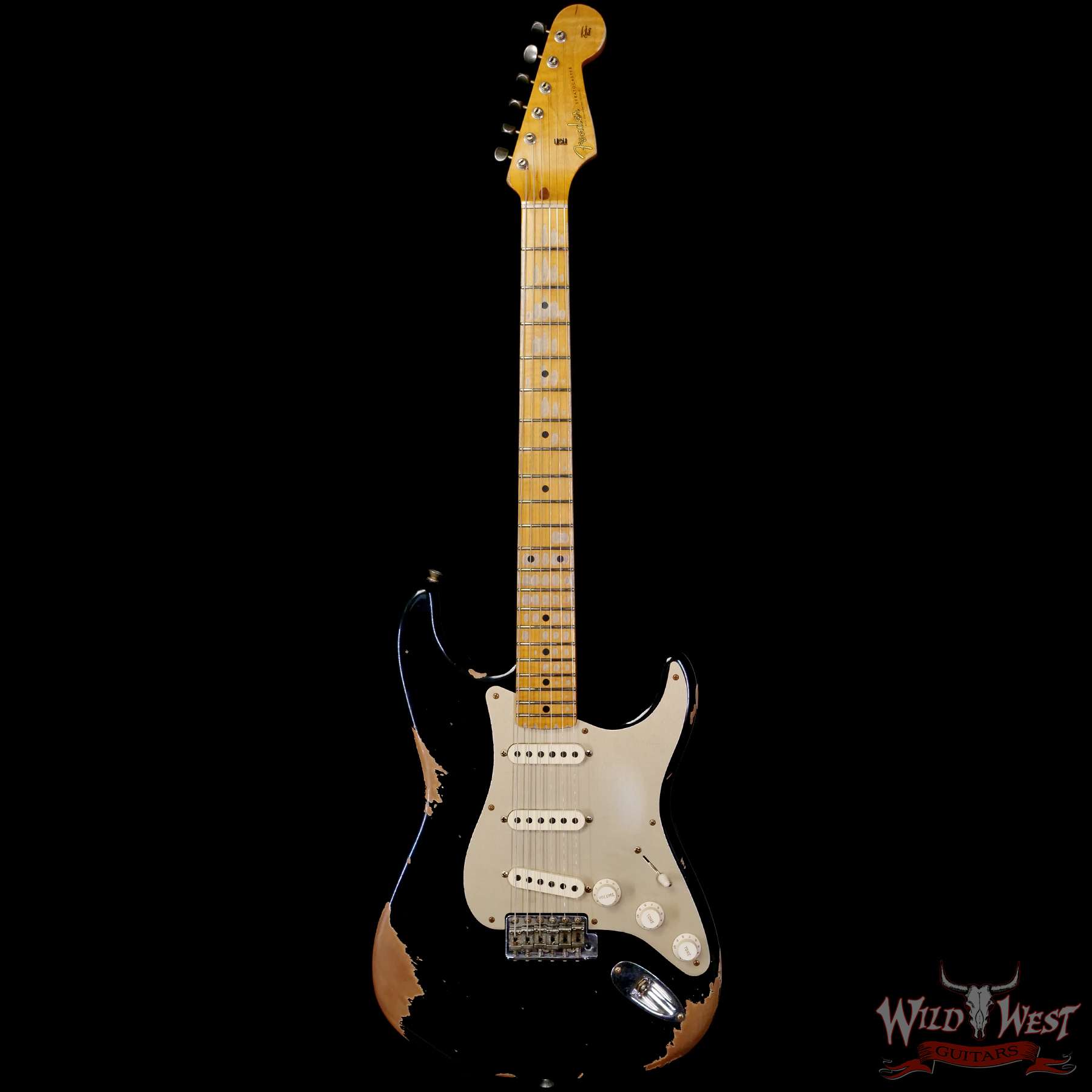 Heavy Relic® Lacquer Finish; 2-Piece Select Alder Body; 1-Piece 2A Flame Maple Neck with 1954 “Soft V” Back-Shape; 9.5” (241 mm) Radius; 21 Narrow Tall (6105) Frets; Custom Shop Hand-Wound Fat ‘50s Single-Coil Strat® Pickups (with RWRP Middle); Fat ‘50s Stratocaster® Wiring; 5-Way Switch; 1-Ply Gold Anodized Aluminum Pickguard; 6-Saddle Vintage-Style Synchronized Tremolo with Bent Steel Saddles; Vintage-Style Tuning Machines; Bone Nut; American Vintage ‘56-‘58 String Tree; Deluxe Hardshell Case; Strap; Certificate of Authenticity.