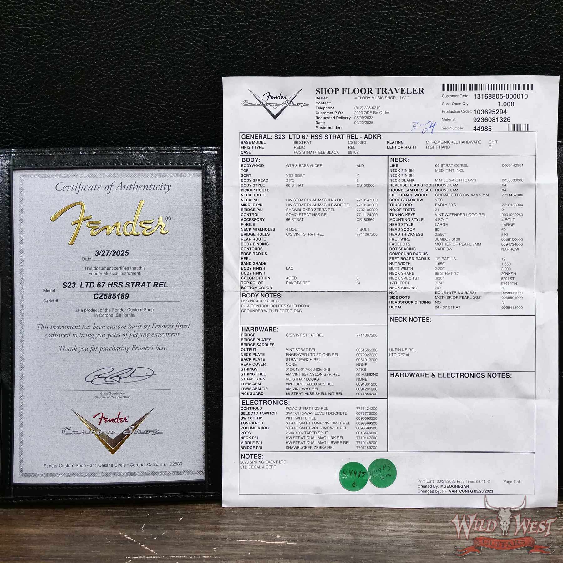 Relic® Lacquer Finish; 2-Piece Select Alder Body; Quartersawn Maple Neck with ‘65 Style “C” Back-Shape; Round-Lam Rosewood Fingerboard; 12” Radius; 21 Jumbo (6100) Frets; Shawbucker™ 1 (Bridge) and Custom Shop Hand-Wound Dual-Mag II Strat (Middle & Neck) Pickups; Postmodern Strat HSS Wiring; 5-Way Switch; 3-Ply Brown Shell Pickguard; Custom Shop Vintage Synchronized Tremolo; Vintage-Style Tuning Machines; Bone Nut; Wing String Tree with Nylon Spacer; Deluxe Hardshell Case; Strap; Certificate of Authenticity.