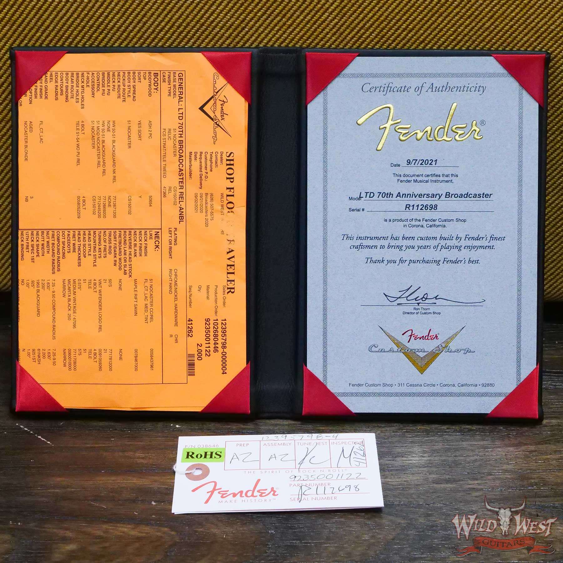 Now, for 2020 alone, the Custom Shop has resurrected this famously rare guitar in honor of its 70th anniversary. The Limited Edition 70th Anniversary Broadcaster has a two-piece select ash body with off-center seam, available in four different Custom Shop aging packages—NOS Time Capsule, Journeyman Relic®, Relic and Heavy Relic—all finished in the original “flash coat” lacquer. The one-piece rift-sawn maple neck has a 1950 Broadcaster profile, 7.25”-9.5” vintage compound-radius fingerboard and 21 medium vintage frets. Other features include hand-wound ’50-’51 Blackguard pickups with ’51 modded “Nocaster” wiring (similar to the original, with blender pot and slightly brighter rhythm setting in the neck position). The guitar comes with a “case candy” kit containing a 70th anniversary neck plate, Fat ’50s control assembly. Also includes deluxe hardshell case, strap and certificate of authenticity.