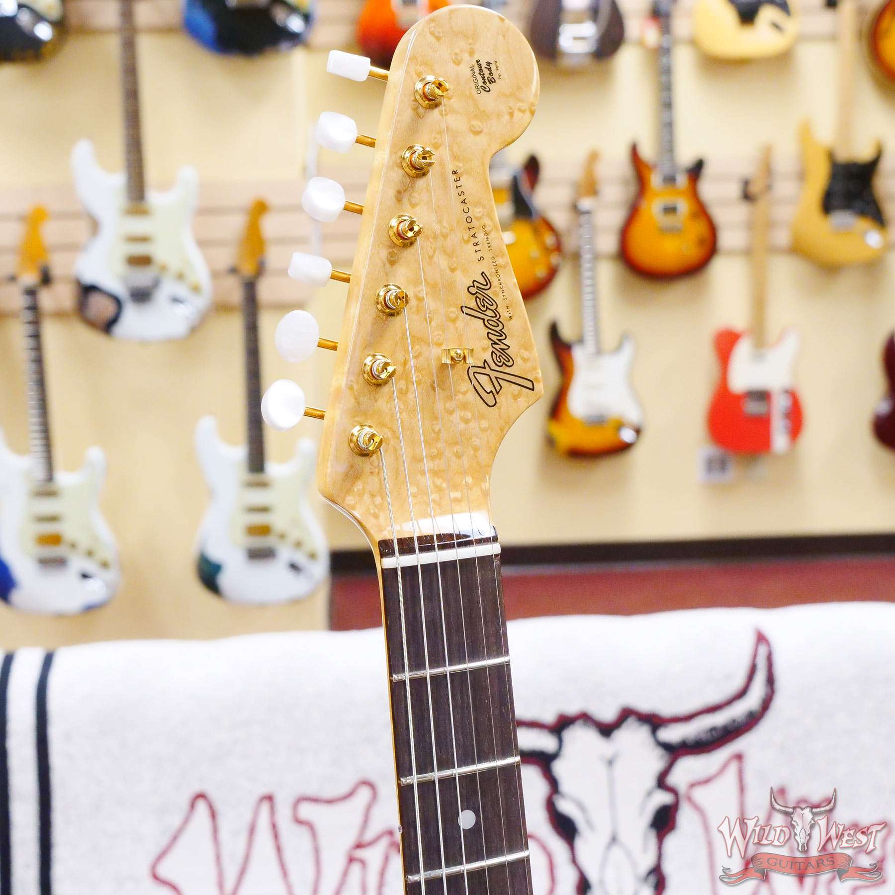 The two-piece select alder body is finished in a decadent “Diamond Pearl” nitrocellulose lacquer. The lightly tinted quartersawn 5A figured birdseye maple neck has a ’60 “oval C” profile and is topped with a round-lam rosewood fingerboard with narrow tall frets, mother-of-pearl face dots and cubic zirconia side dots. The eight-hole gold anodized pickguard holds three hand-wound Fat ’60s pickups (with reverse-wound/reverse-polarity in the middle), five-way switching and Fat ’50s Strat wiring for powerful tone with transparent bloom. Other features include Custom Shop vintage synchronized tremolo, vintage-style tuning machines with pearl buttons, bone nut, and “wing” string tree with metal spacer. Includes deluxe hardshell case, strap and certificate of authenticity.