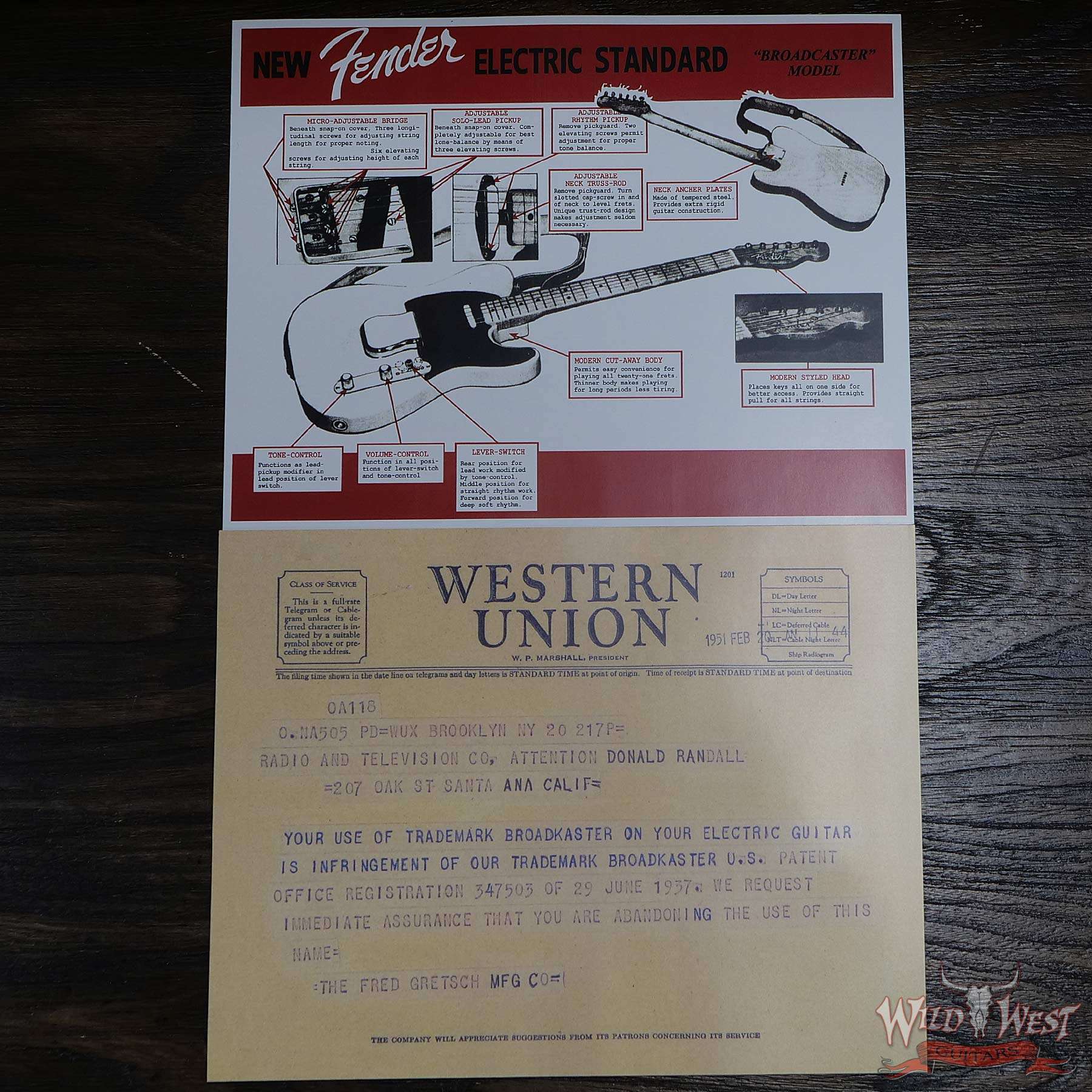 Fender changed the music world forever in October 1950 with the first dual-pickup electric Spanish guitar—the Broadcaster®. The instrument vaulted Fender into the mainstream of electric guitar, with gorgeous features and smart innovations including an ash body with a translucent blonde nitrocellulose finish, sturdy maple neck with rear-installed truss rod for solid stability (with a walnut “skunk stripe”), single-ply black phenolic pickguard, two loud-and-clear pickups and versatile wiring for three distinctive tone settings. Revolutionary as it was, however, the Broadcaster was short lived—produced only for a couple months until January 1951 because of an already-existing trademark on the name held by the Fred Gretsch Manufacturing Company, Inc..