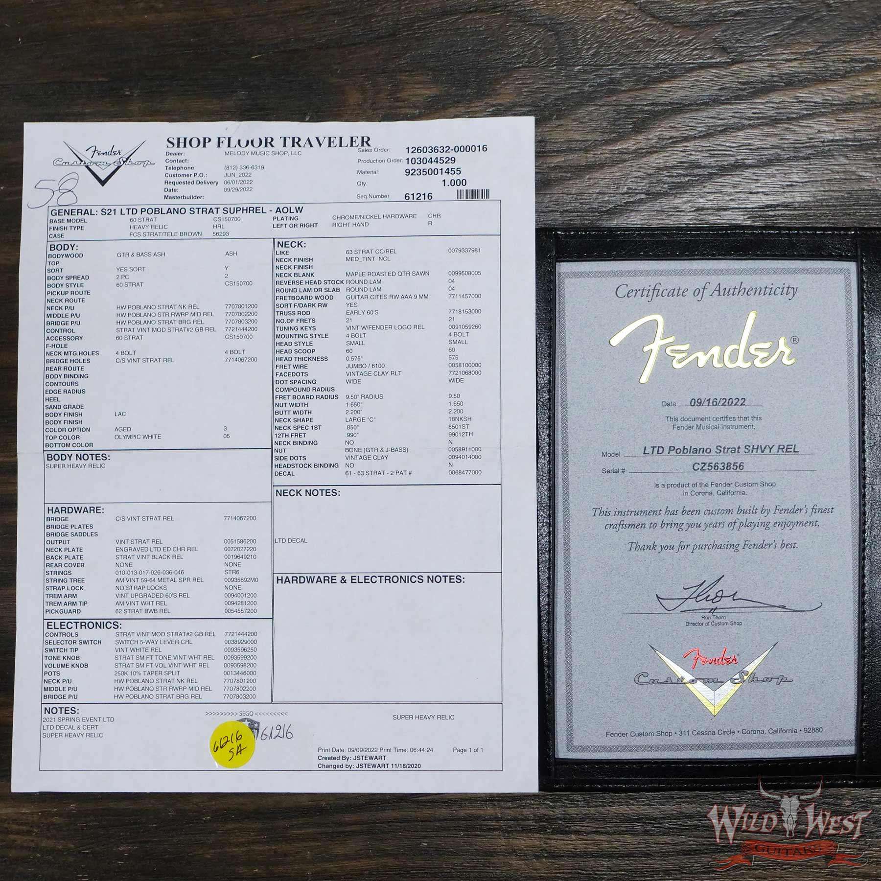 Super Heavy Relic® Lacquer Finish; 2-Piece Select Ash Body; Roasted Quartersawn Maple Neck with Round-Lam Rosewood Fingerboard; Large “C” Back-Shape; 9.5” Radius; 21 Jumbo Frets (6100); Hand-Wound Ancho Poblano Strat® Pickups with RWRP Middle; Vintage Modified #2 Wiring with Tone-Saver Bleed; 5-Way Switch; 3-Ply Black Pickguard; Custom Shop Vintage Synchronized Tremolo; Vintage-Style Tuning Machines; Bone Nut; Wing String Tree with Tall Metal Spacer; Deluxe Hardshell Case; Strap; Certificate of Authenticity.