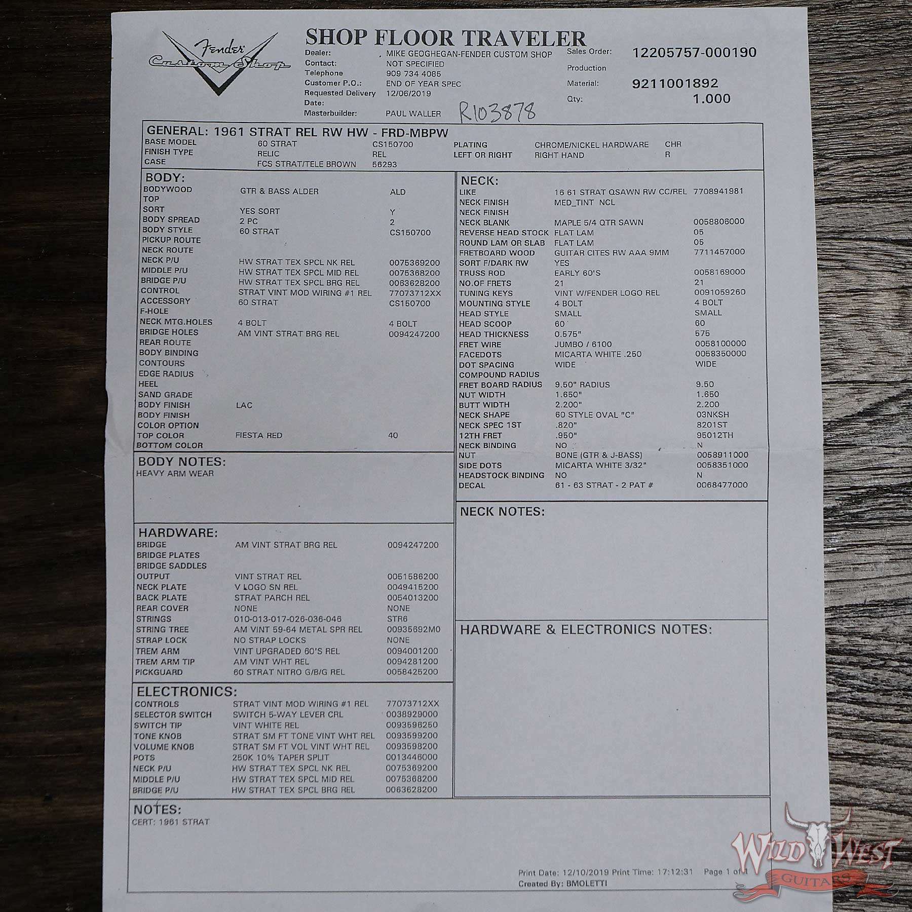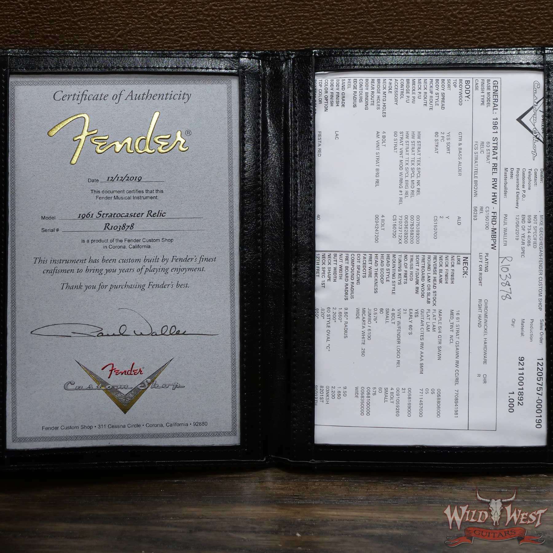 Fender Custom Shop Paul Waller Maserbuilt 1961 Stratocaster Relic Hand-Wound Pickups Rosewood Slab Board Fiesta Red