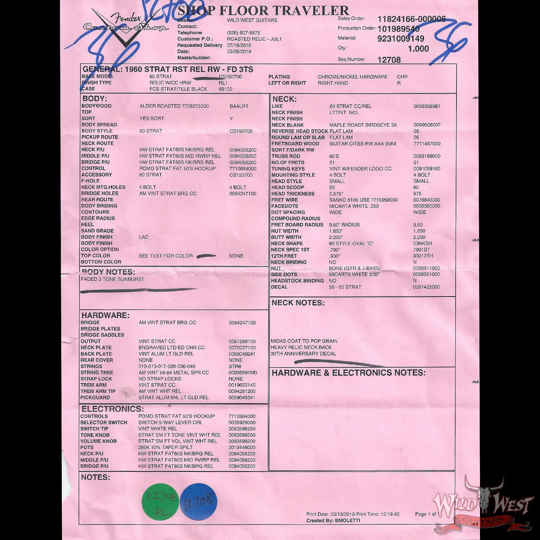 Fender Custom Shop Roasted 1960 Stratocaster Birdseye Maple Neck Slab 3A Rosewood Board Relic 3 Tone Sunburst