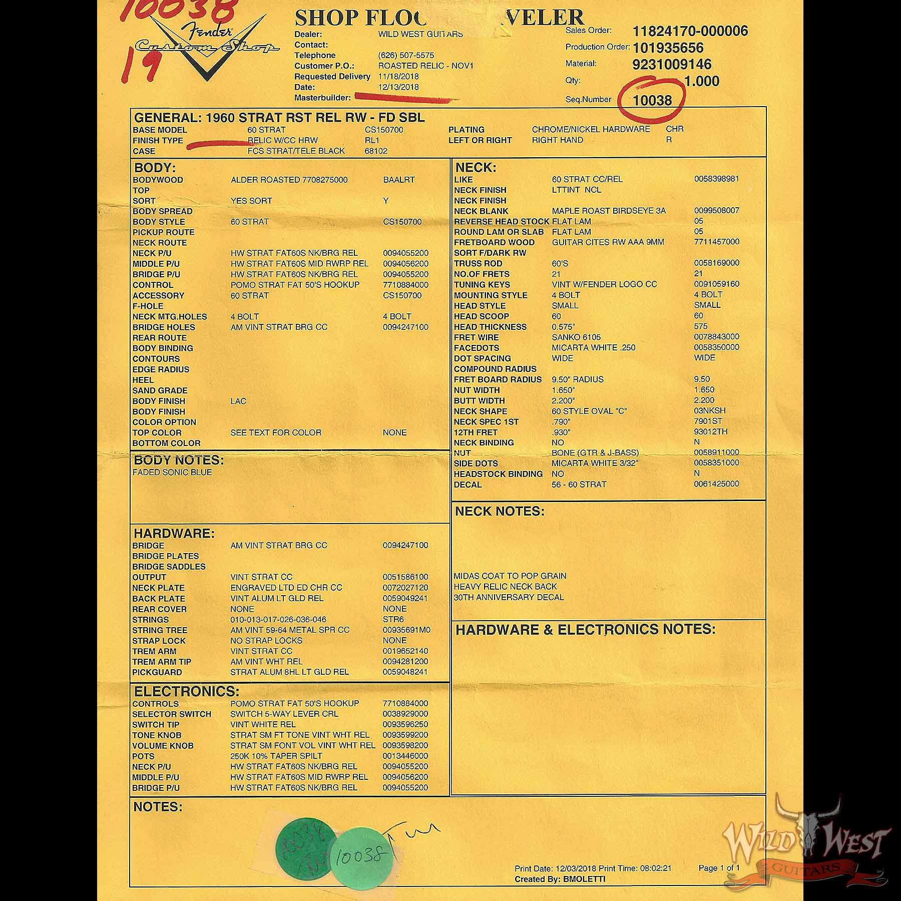 Fender Custom Shop Roasted 1960 Stratocaster Relic Birdseye Neck Slab AAA Rosewood Board Faded Sonic Blue