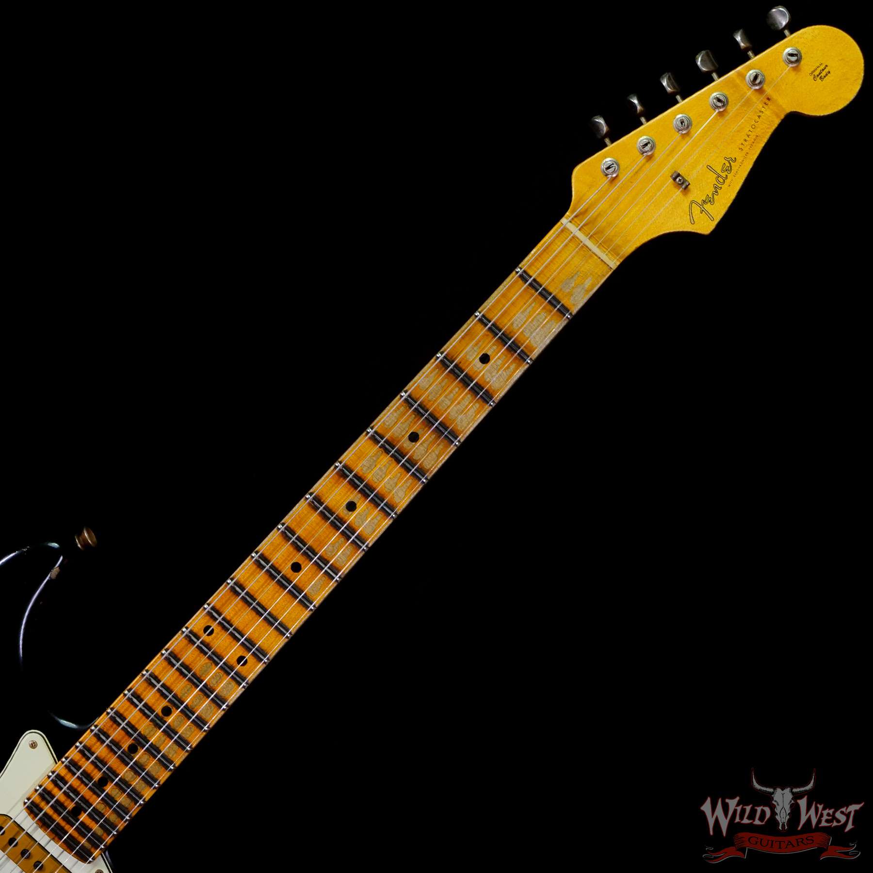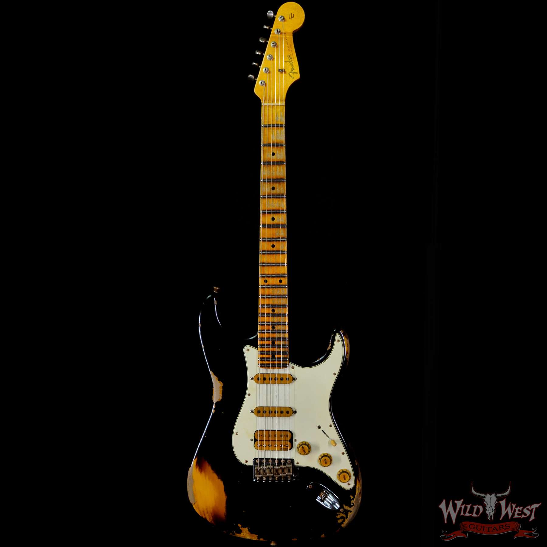 White Lightning (Black Lightning) Strikes The Dusty Plains of The Wild West! White Lightning rips all day n’ rocks all night with traditional Fender tremolo system firepower. The molten Wild West Fender Custom Shop Exclusive Heavy Relic Dirty Neck monster rules the rock n’ roll wastelands, packing a pair of Fat 50s relic single coils and a killer DiMarzio Tone Zone humbucker in the bridge position.