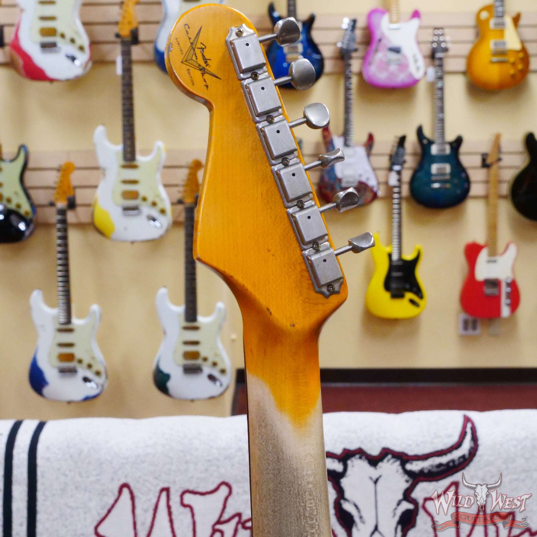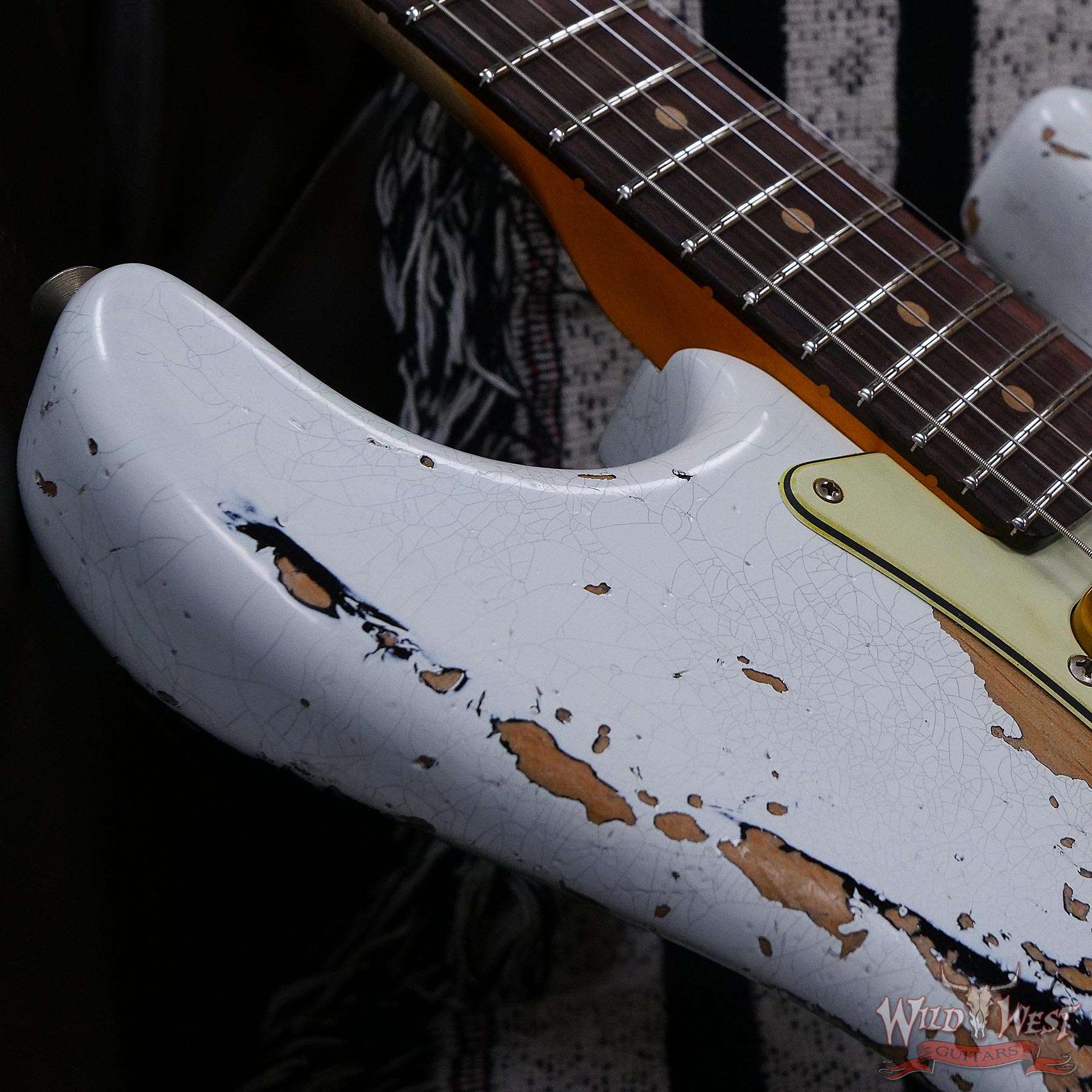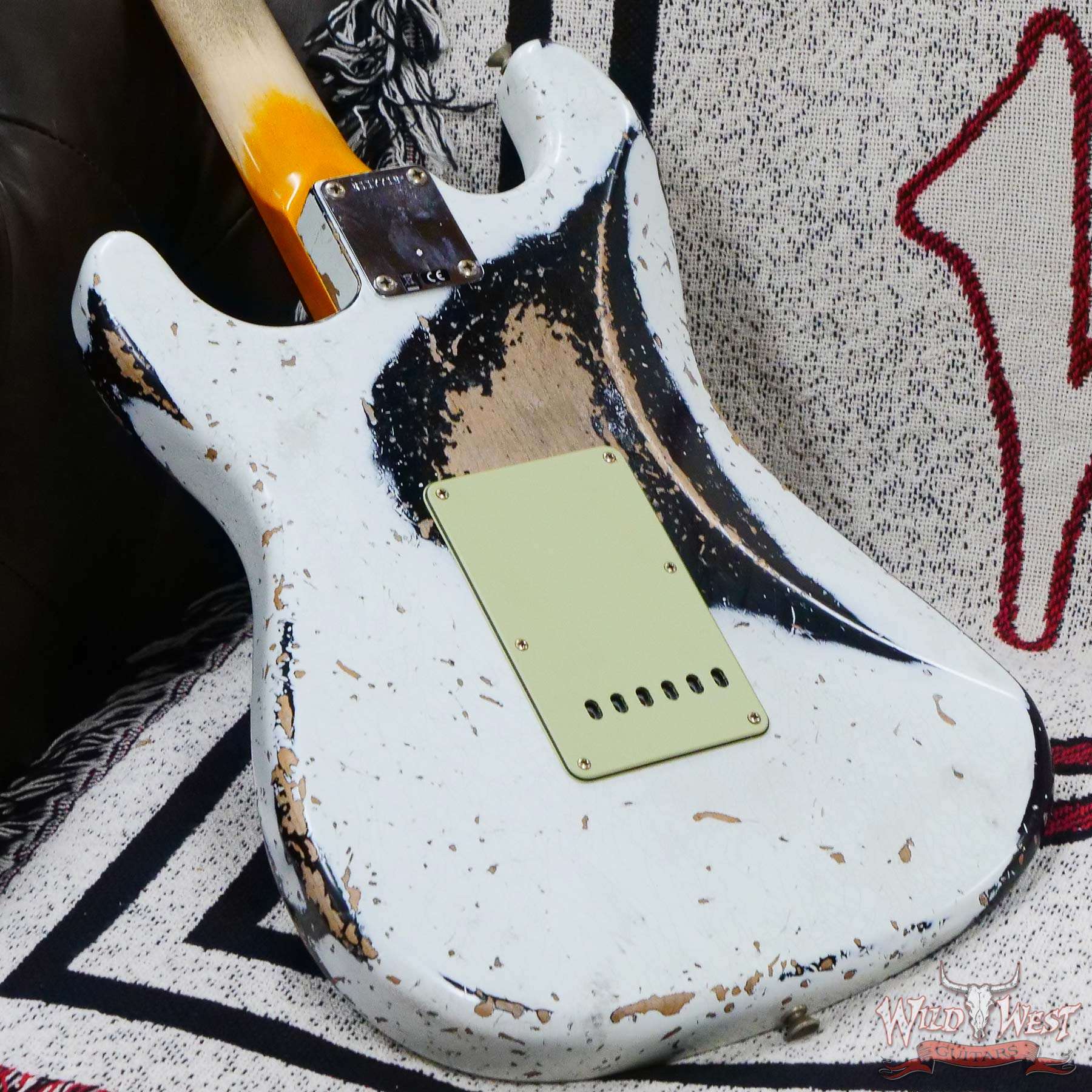 White Lightning Strikes The Dusty Plains of The Wild West! White Lightning rips all day n’ rocks all night with traditional Fender tremolo system firepower. The molten Wild West Fender Custom Shop Exclusive Heavy Relic Dirty Neck monster rules the rock n’ roll wastelands, packing a pair of Fat 50s relic single coils and a killer DiMarzio Tone Zone humbucker in the bridge position.