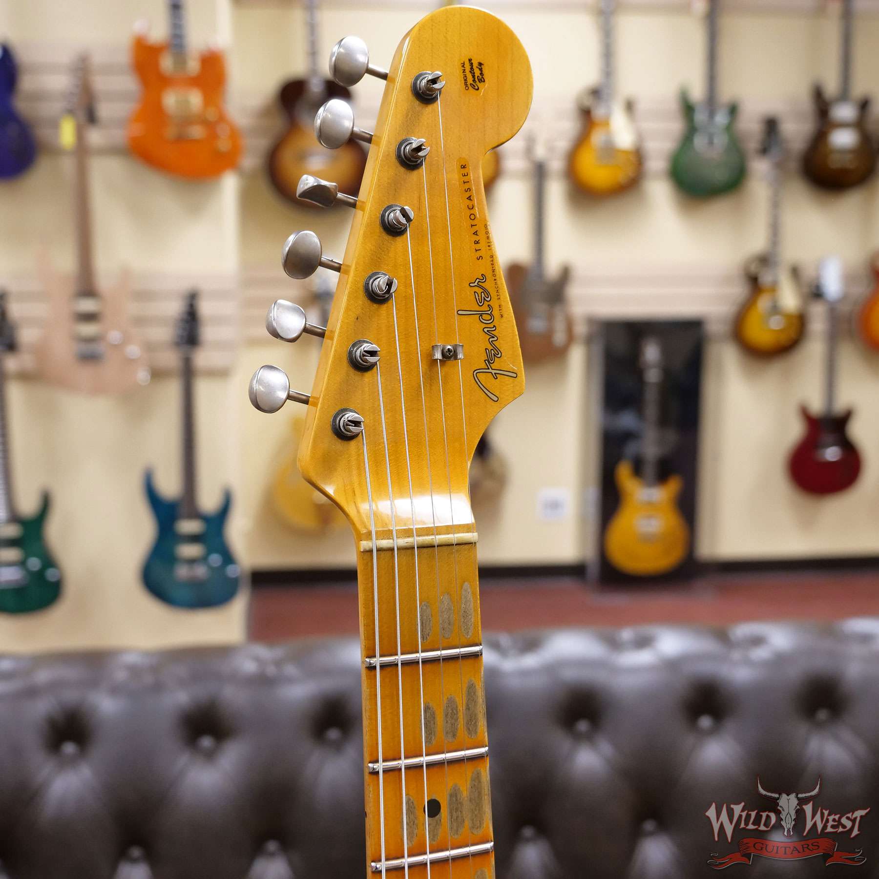 White Lightning Strikes The Dusty Plains of The Wild West! White Lightning rips all day n’ rocks all night with traditional Fender tremolo system firepower. The molten Wild West Fender Custom Shop Exclusive Heavy Relic Dirty Neck monster rules the rock n’ roll wastelands, packing a pair of Fat 50s relic single coils and a killer DiMarzio Tone Zone humbucker in the bridge position.