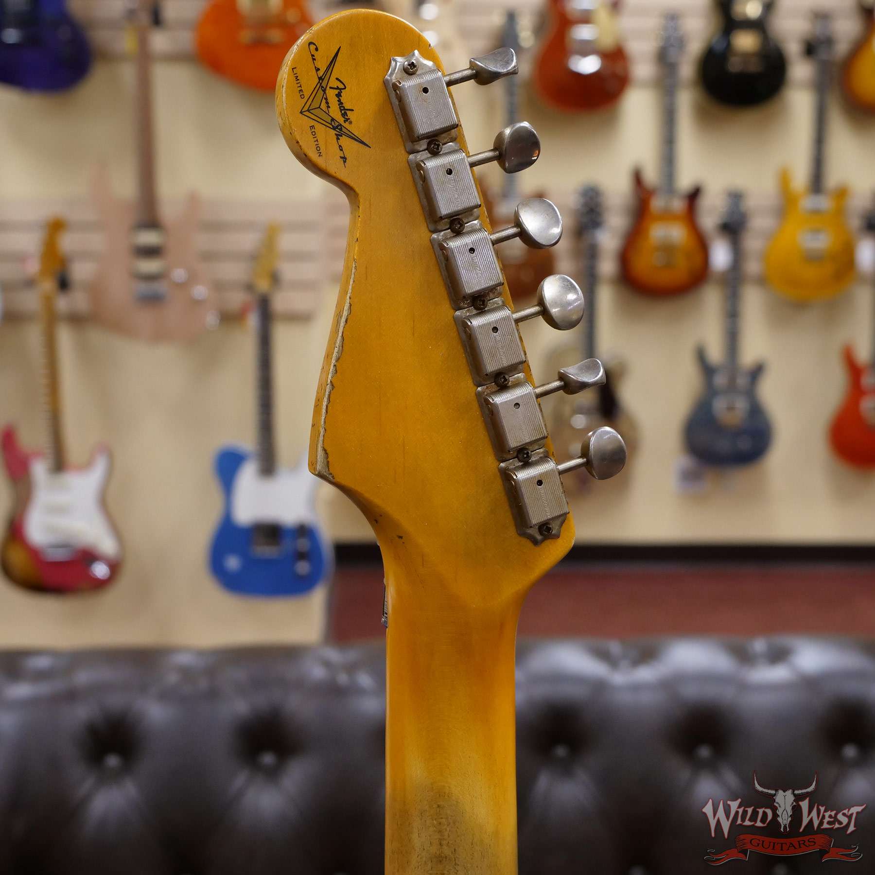 White Lightning Strikes The Dusty Plains of The Wild West! White Lightning rips all day n’ rocks all night with traditional Fender tremolo system firepower. The molten Wild West Fender Custom Shop Exclusive Heavy Relic Dirty Neck monster rules the rock n’ roll wastelands, packing a pair of Fat 50s relic single coils and a killer DiMarzio Tone Zone humbucker in the bridge position.