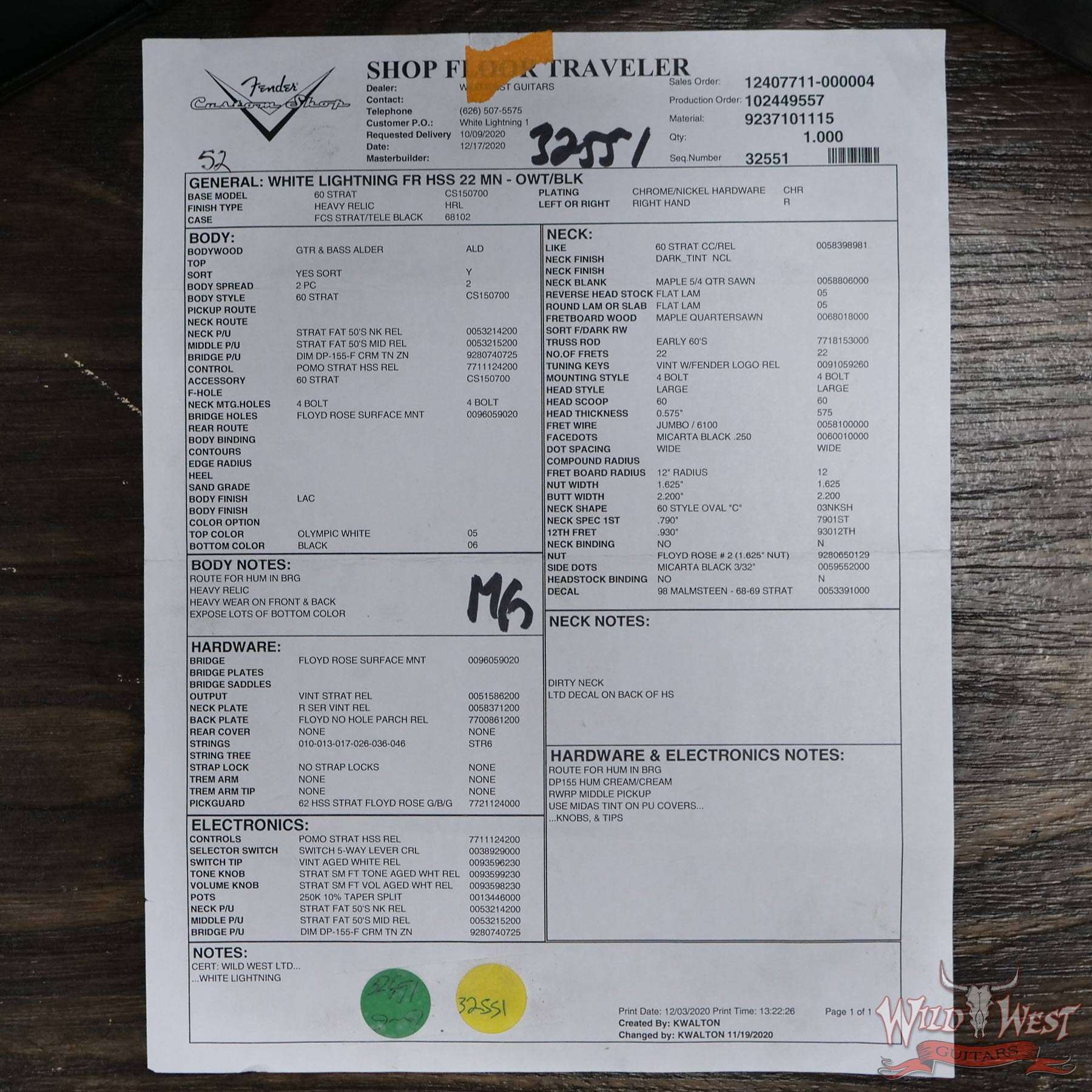 Fender Custom Shop Wild West White Lightning Stratocaster Floyd Rose Heavy Relic Maple Fingeboard Black