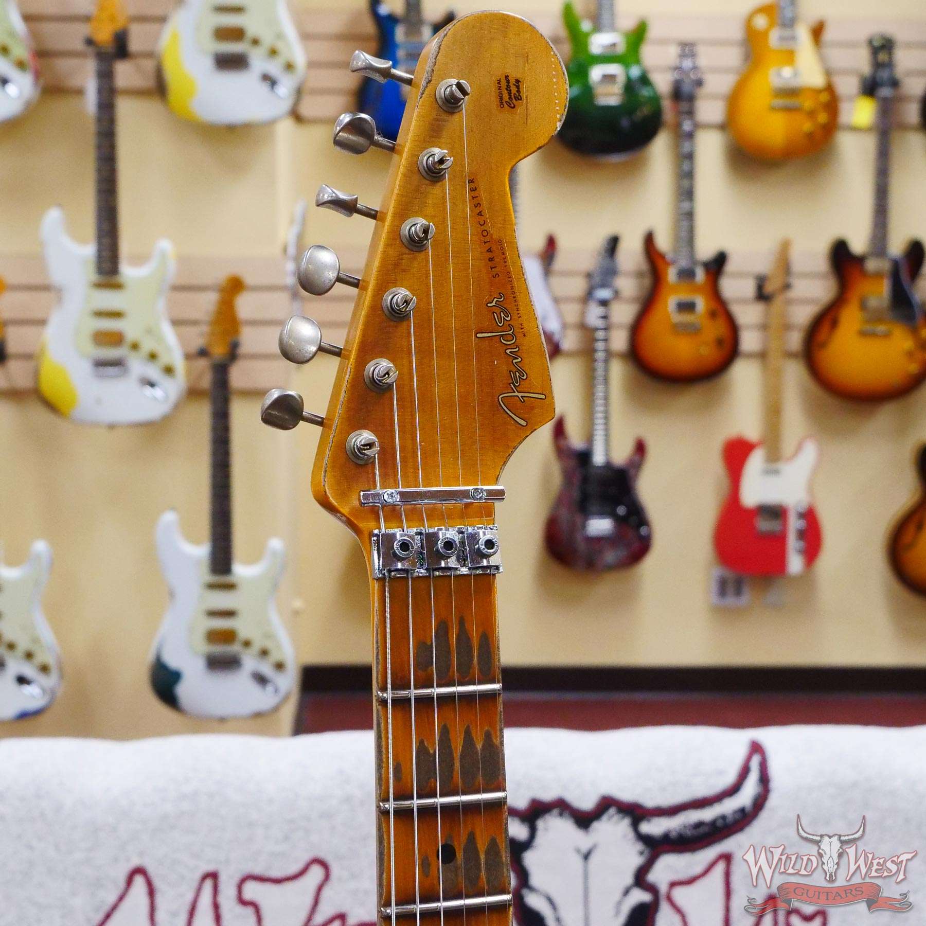 White Lightning(Black Lightning) Strikes The Dusty Plains of The Wild West! White Lightning rips all day n’ rocks all night with traditional Fender tremolo system firepower. The molten Wild West Fender Custom Shop Exclusive Heavy Relic Dirty Neck monster rules the rock n’ roll wastelands, packing a pair of Fat 50s relic single coils and a killer DiMarzio Tone Zone humbucker in the bridge position.