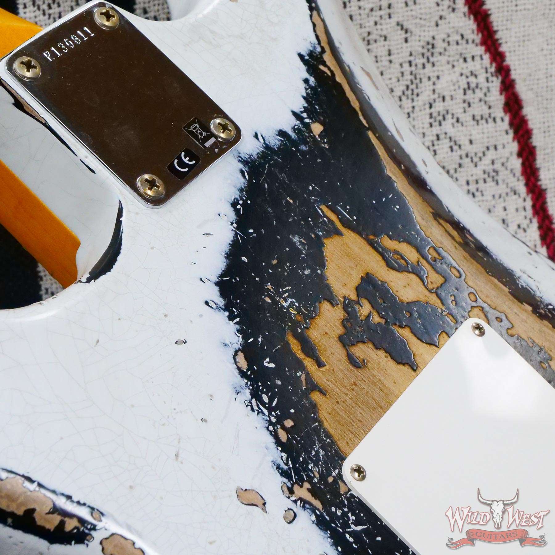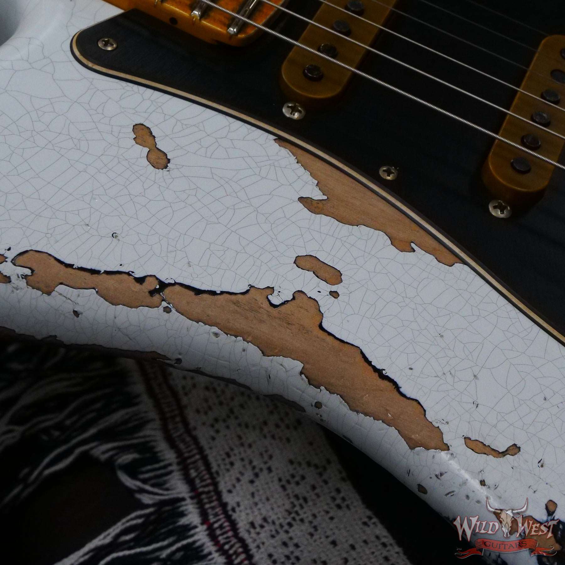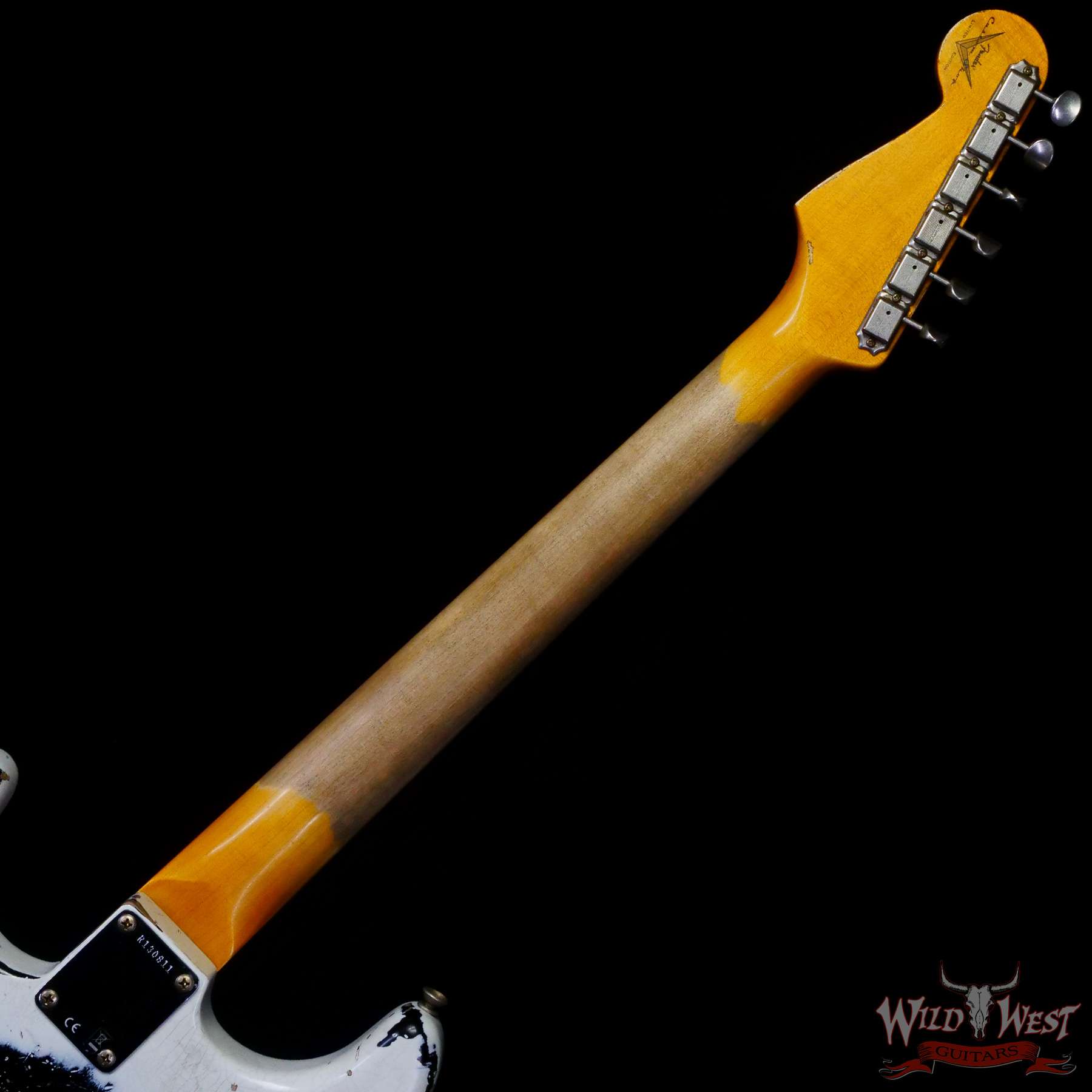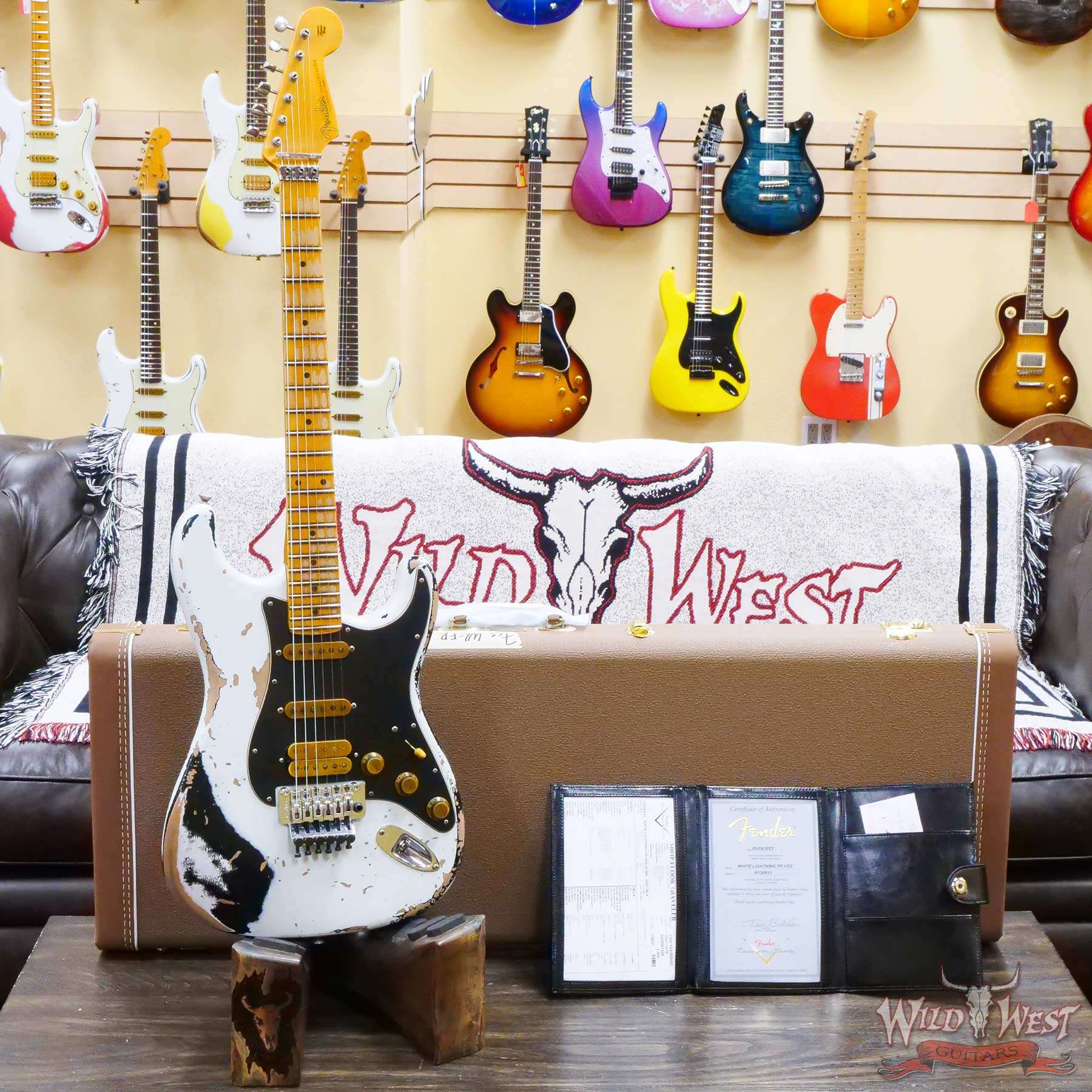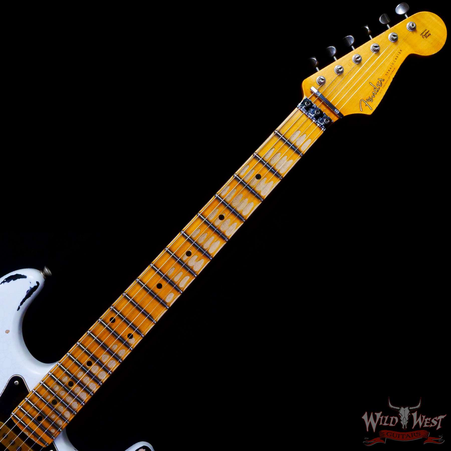 White Lightning(Black Lightning) Strikes The Dusty Plains of The Wild West! White Lightning rips all day n’ rocks all night with traditional Fender tremolo system firepower. The molten Wild West Fender Custom Shop Exclusive Heavy Relic Dirty Neck monster rules the rock n’ roll wastelands, packing a pair of Fat 50s relic single coils and a killer DiMarzio Tone Zone humbucker in the bridge position.